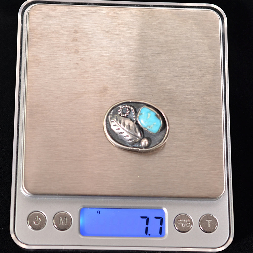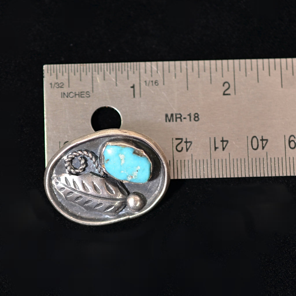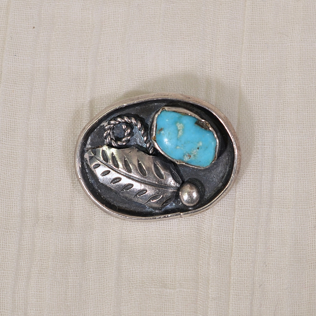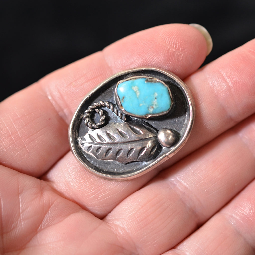 Lovely vintage oval shape sterling silver brooch with leaf detail and a bezel set turquoise.