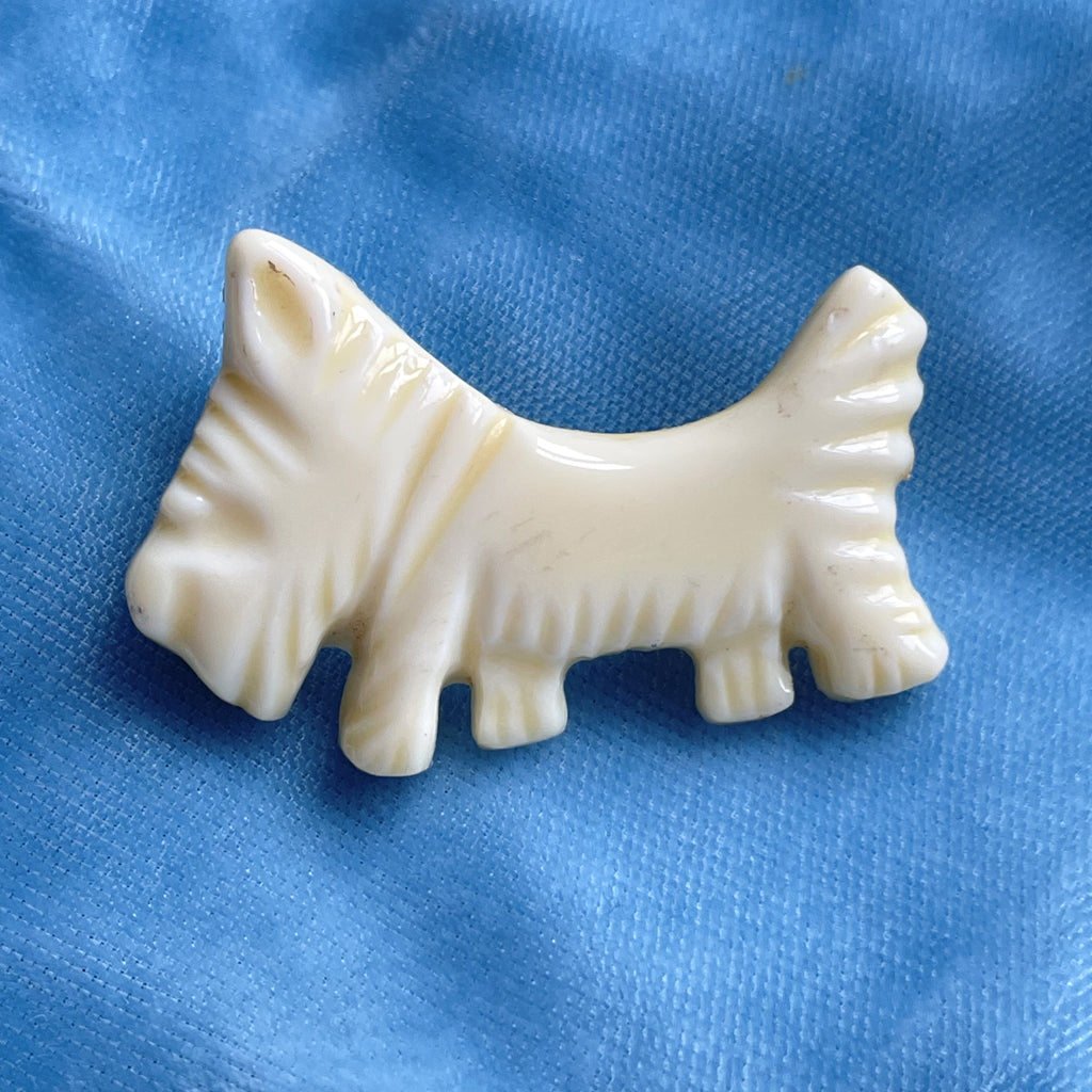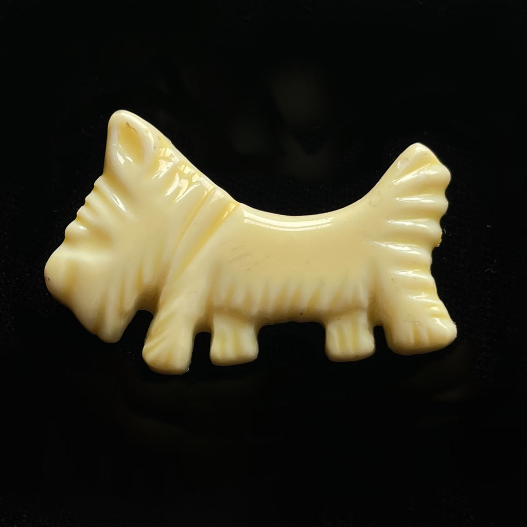 Very cute small carved or pressed dog brooch. It looks like a Scotty dog.