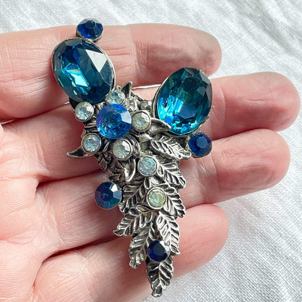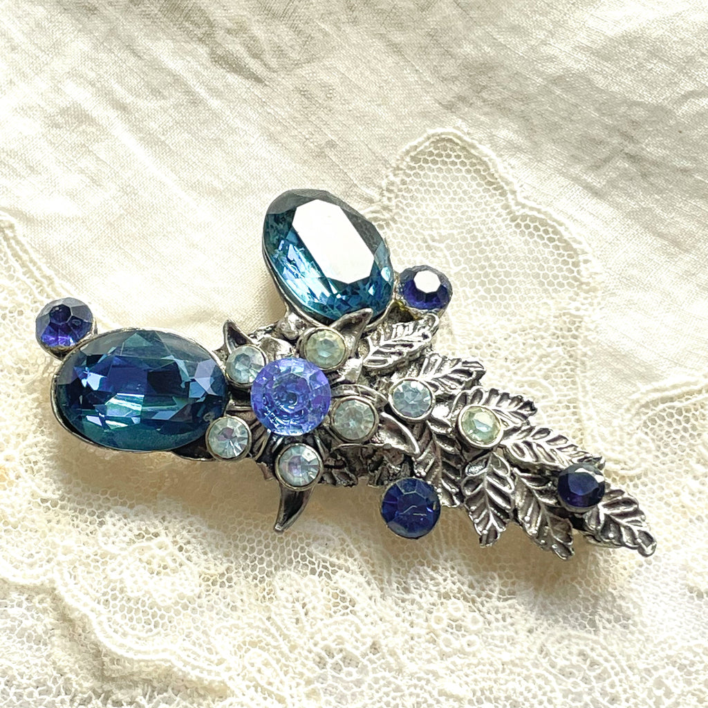 Vintage 1940s brooch, assorted blue crystal/glass rhinestones.