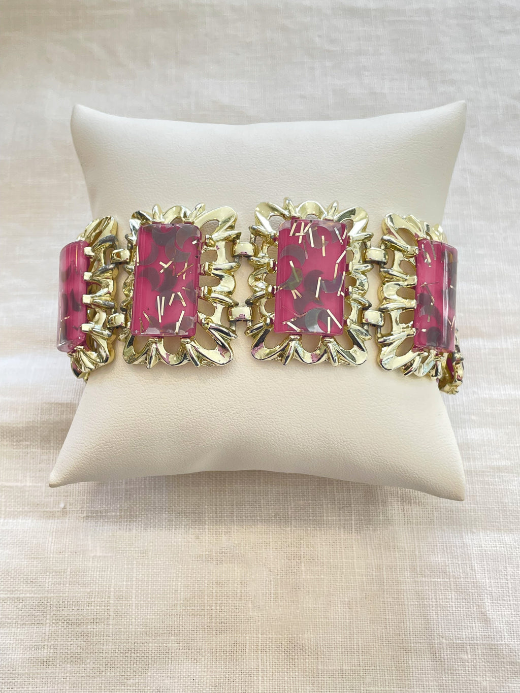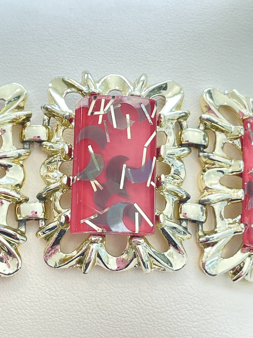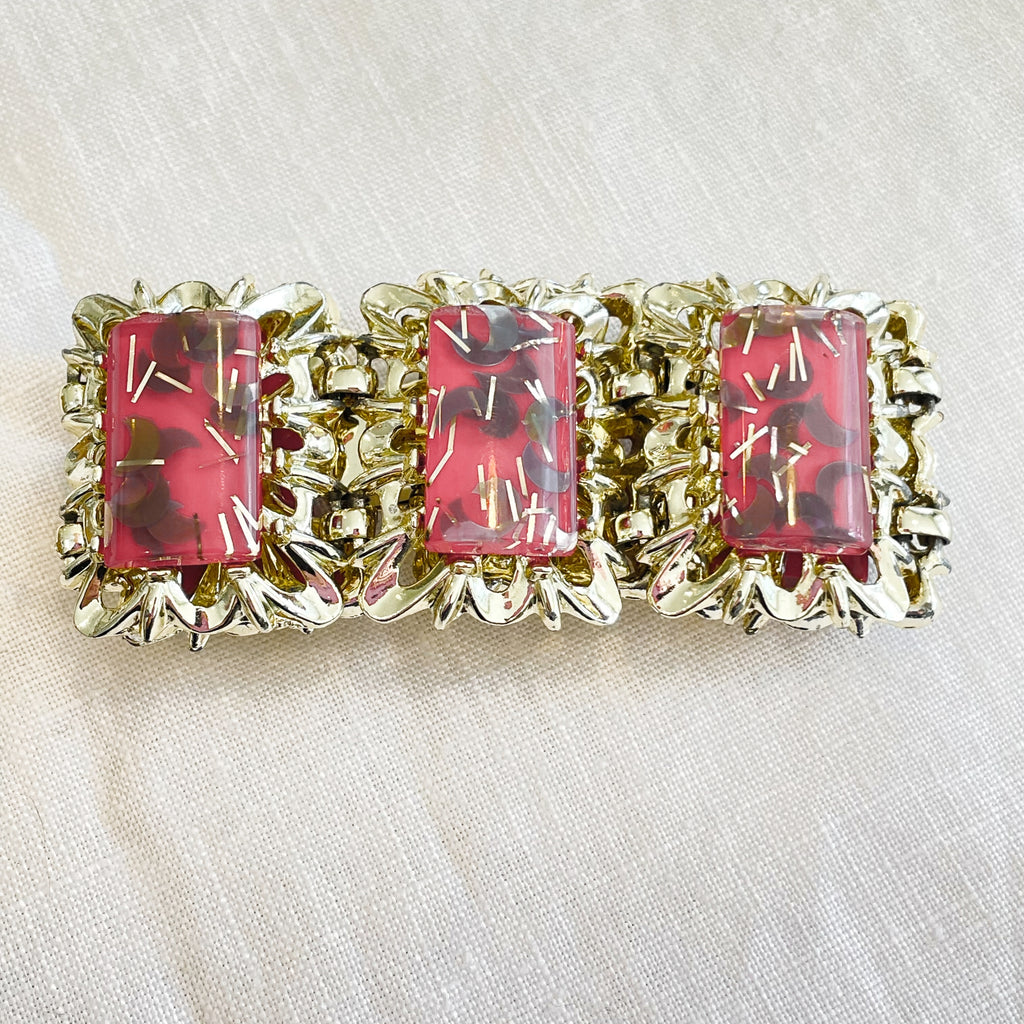 Lovely 6 panel bracelet, shiny light gold tone, watermelon pink & gold sparkle confetti stones.