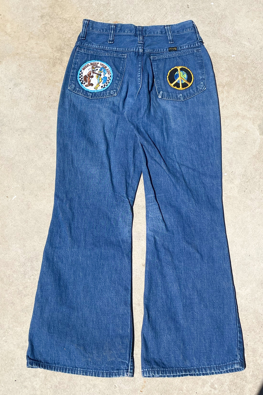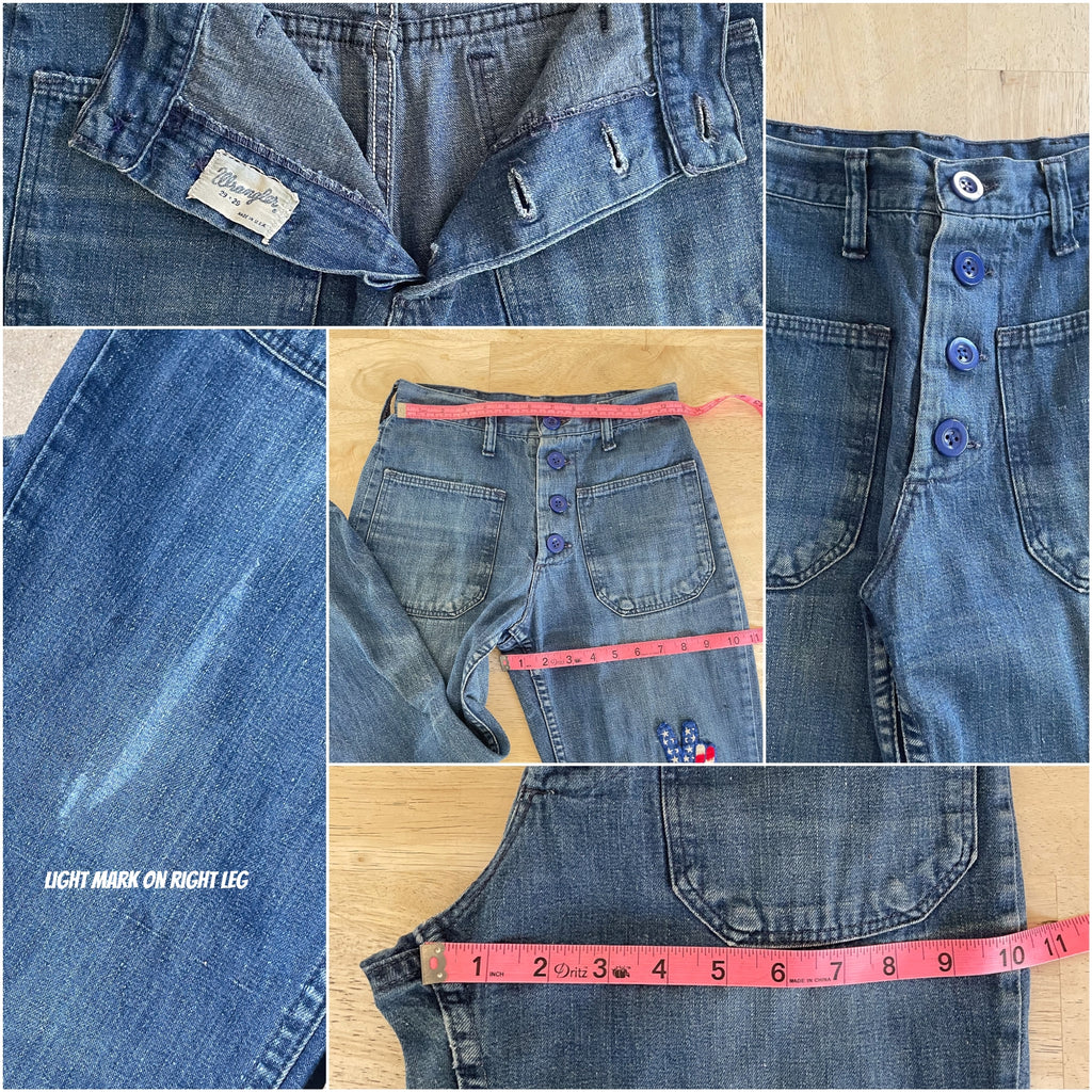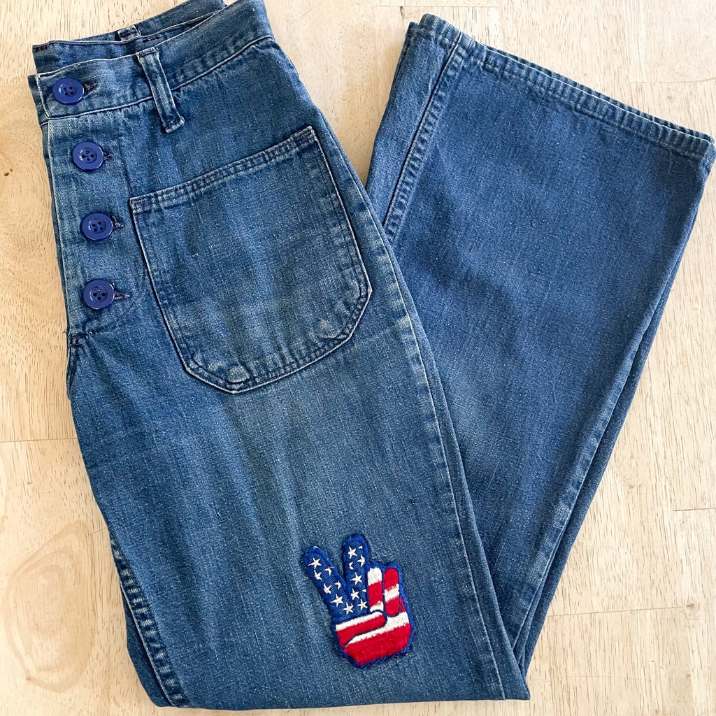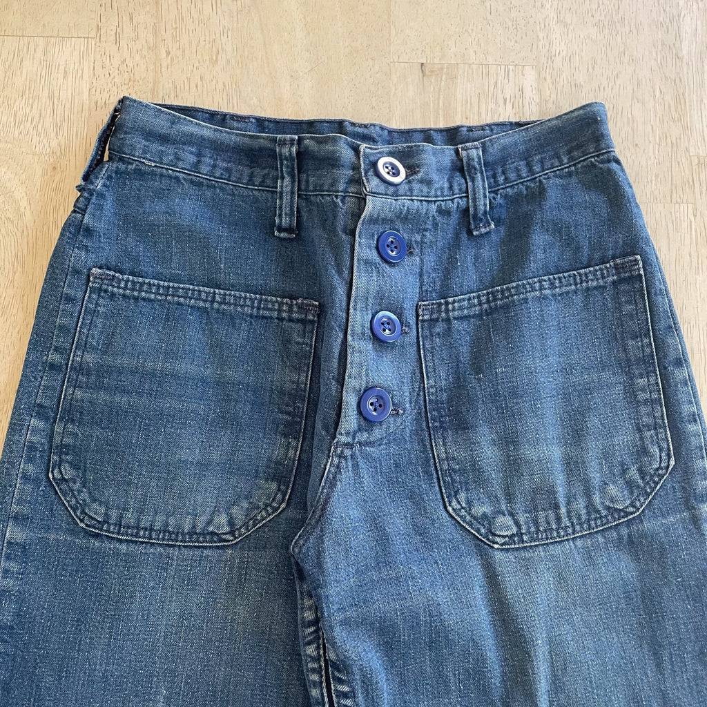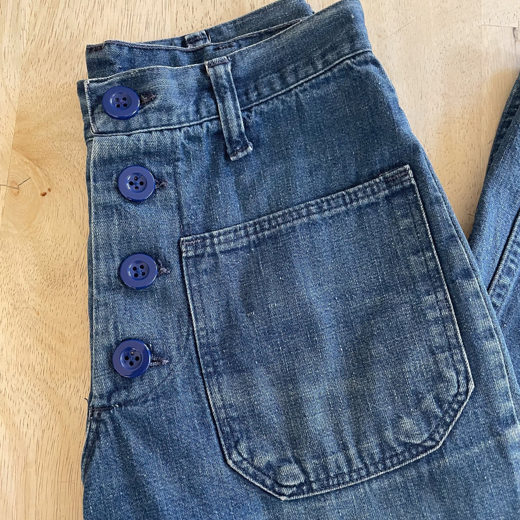 Vintage denim jeans with buttons up the front and patch pockets on the front and back.