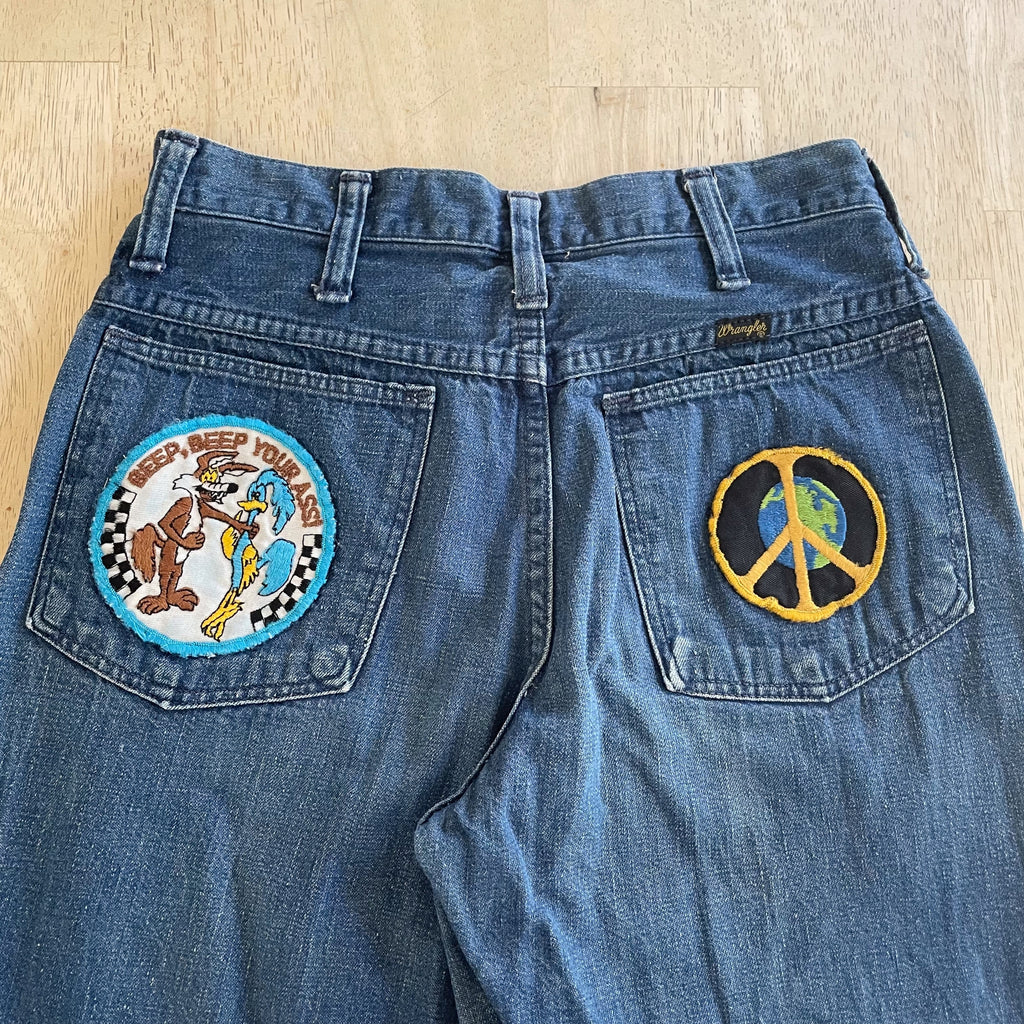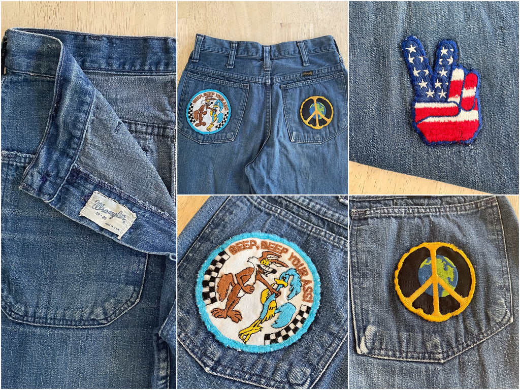 Cute peace sign patches and a Beep Beep Your Ass Roadrunner Wiley Coyote patch. |