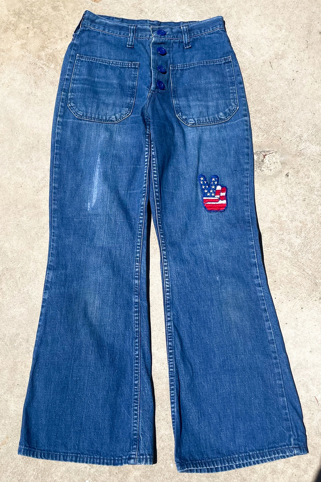 High waist, with waistband bell bottom jeans. ca-1960s/70s