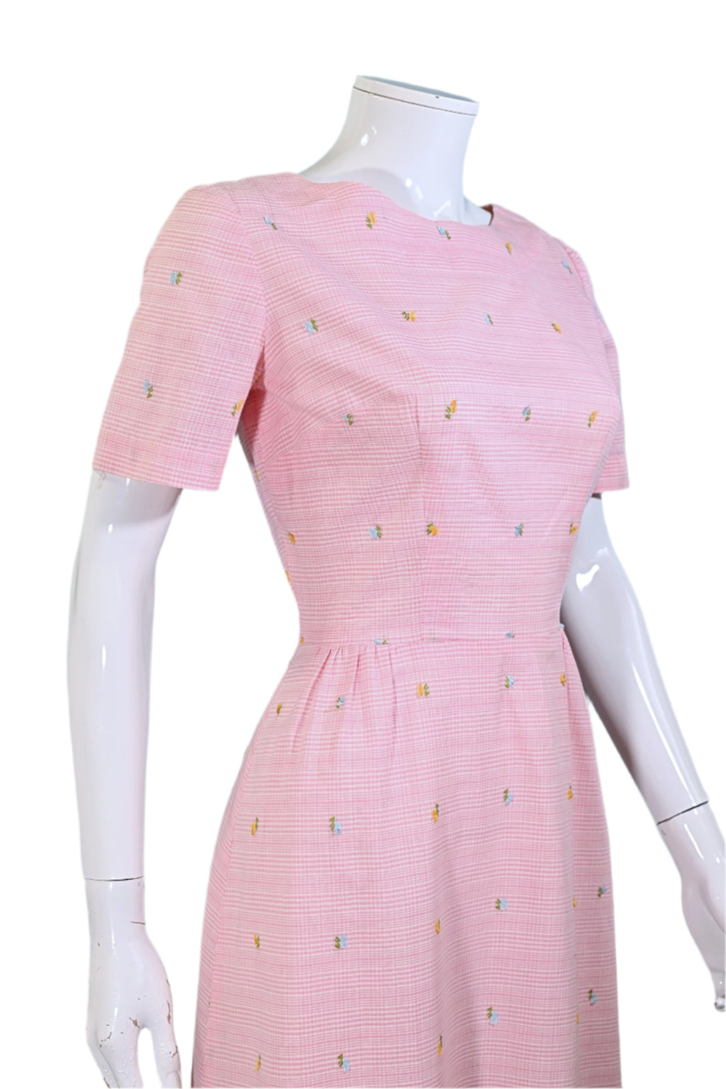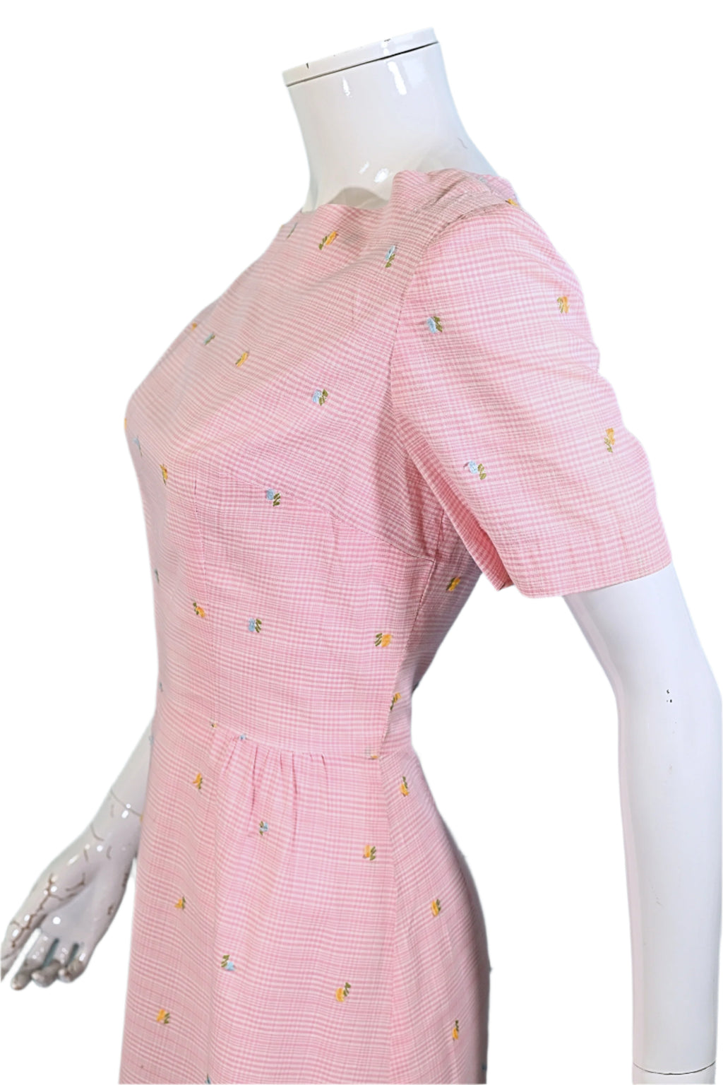 Fitted waist, small gathers below the waist at front sides, A-line skirt.