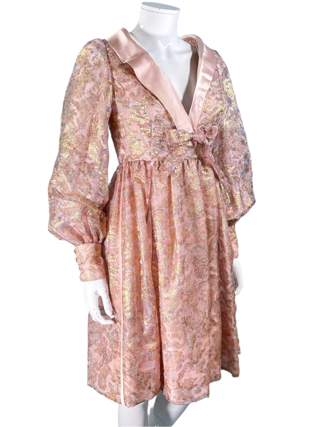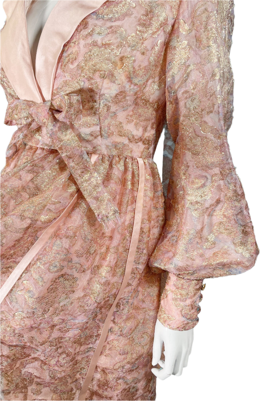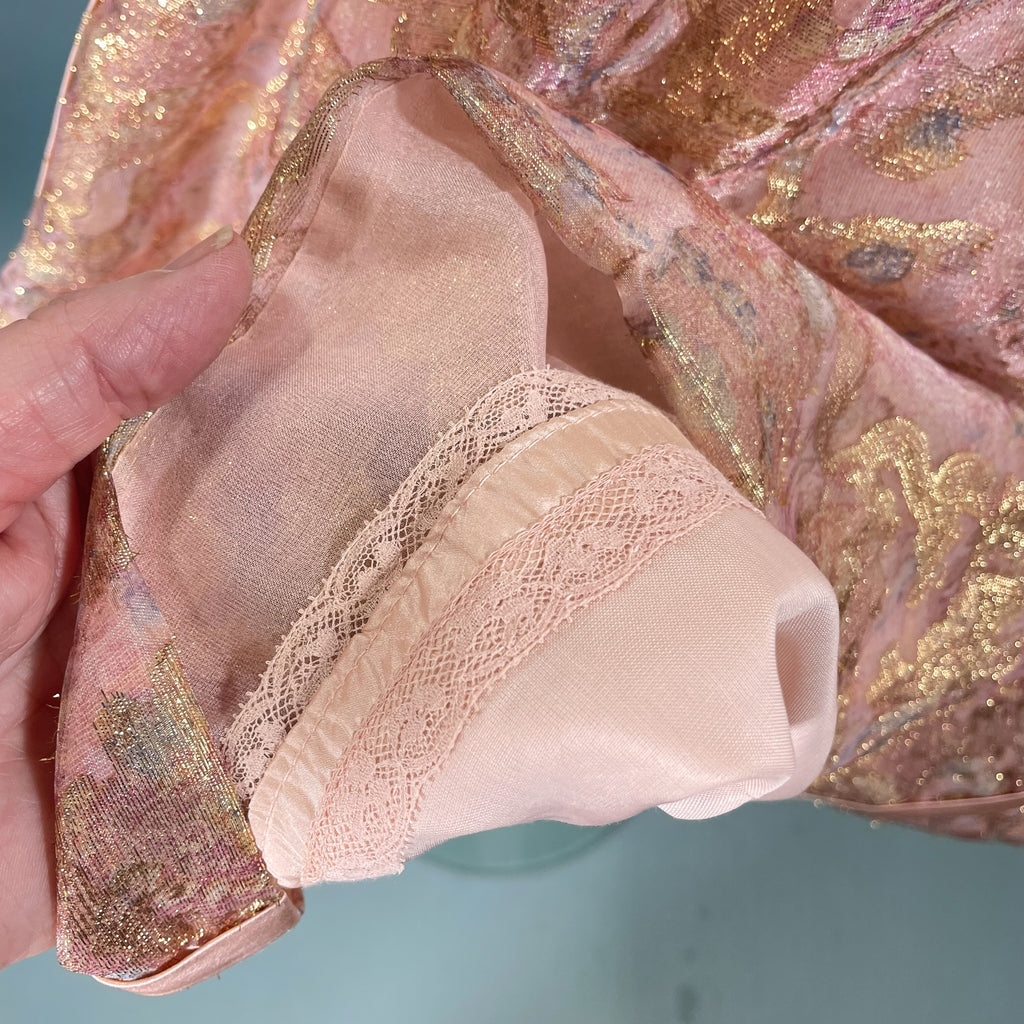 The fabric is semi sheer pink with blue and metallic gold accents.
