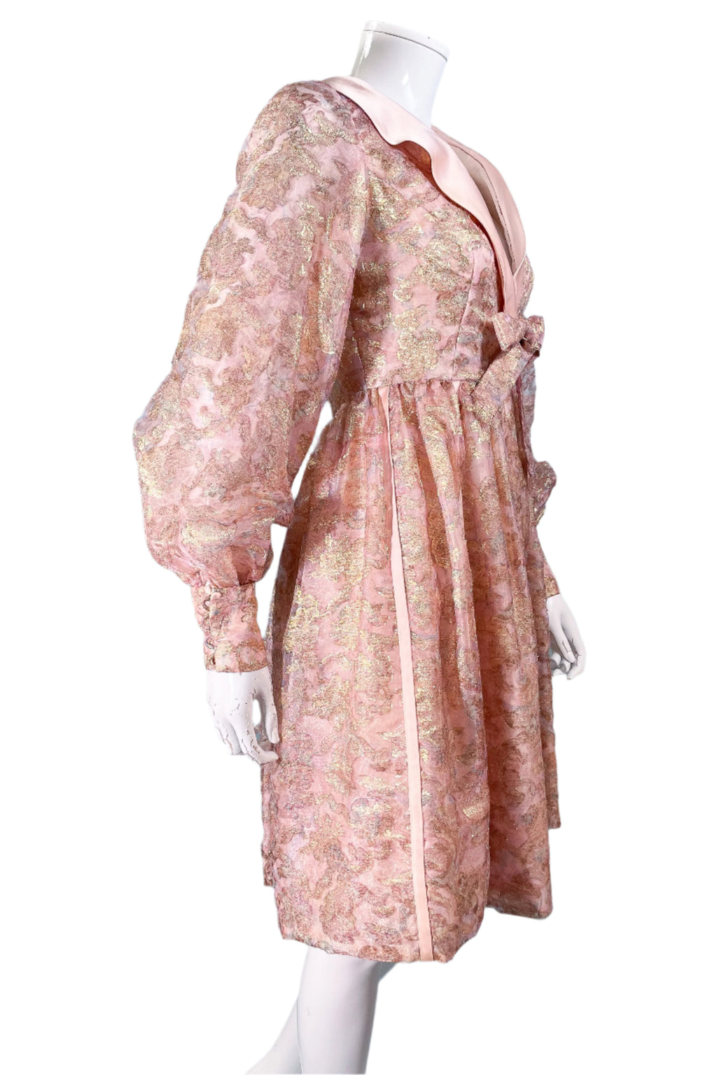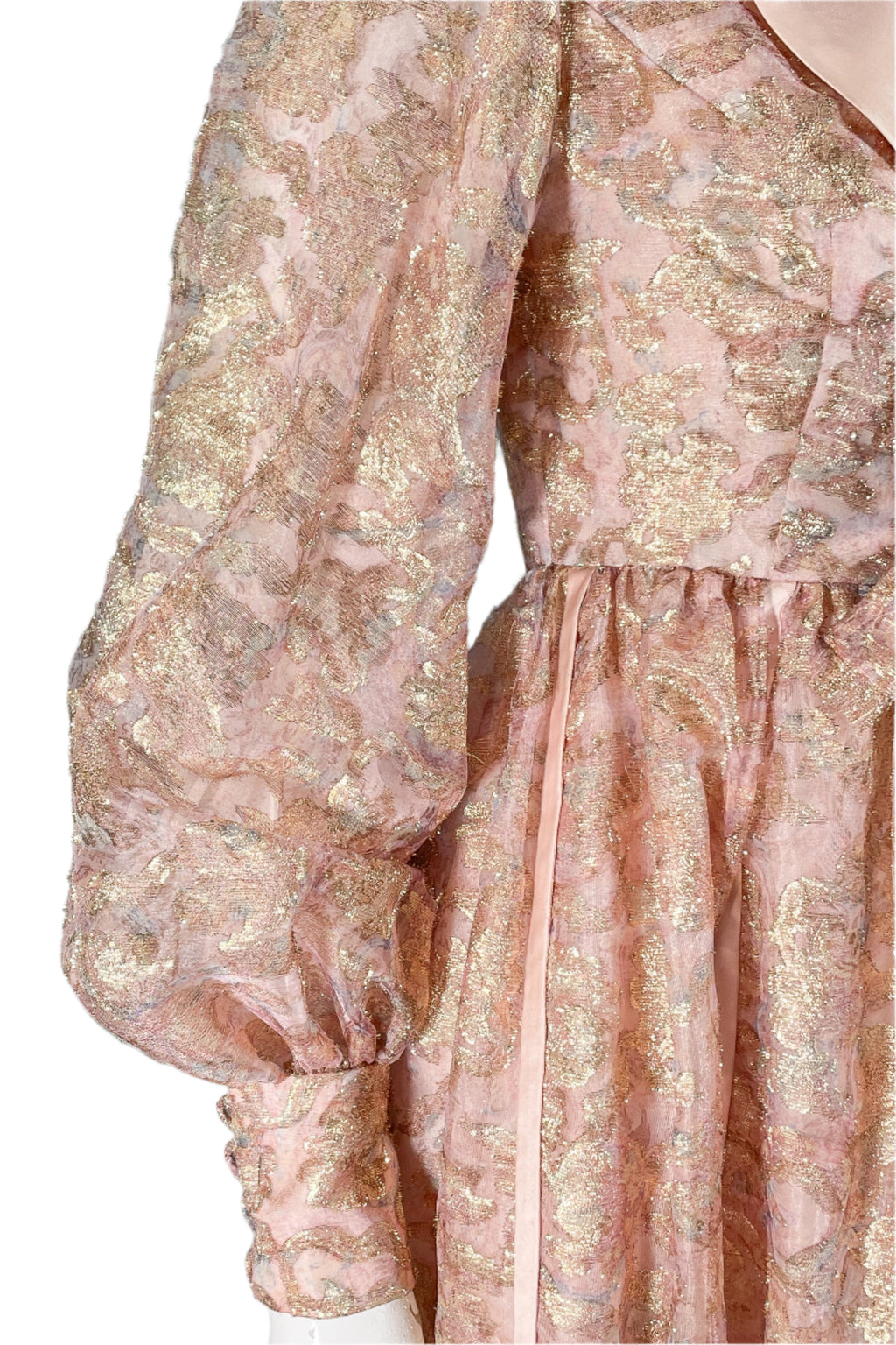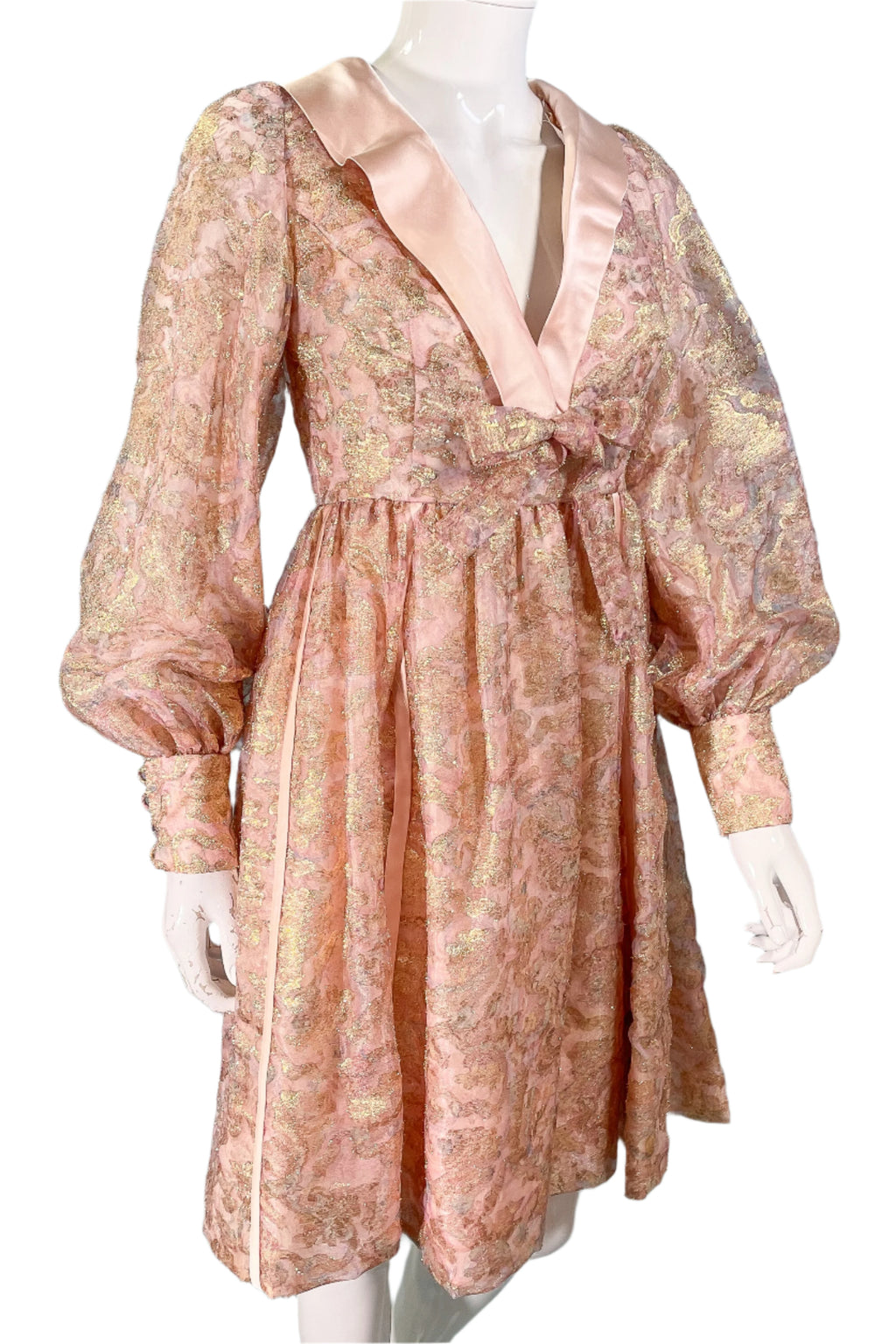 The fabric is semi sheer pink with blue and metallic gold accents.