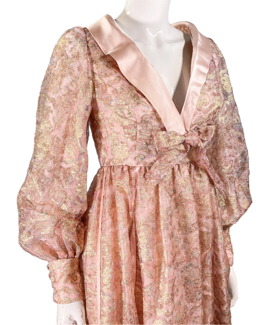 V neck with satin trim, long full sleeves, satin details in the skirt.