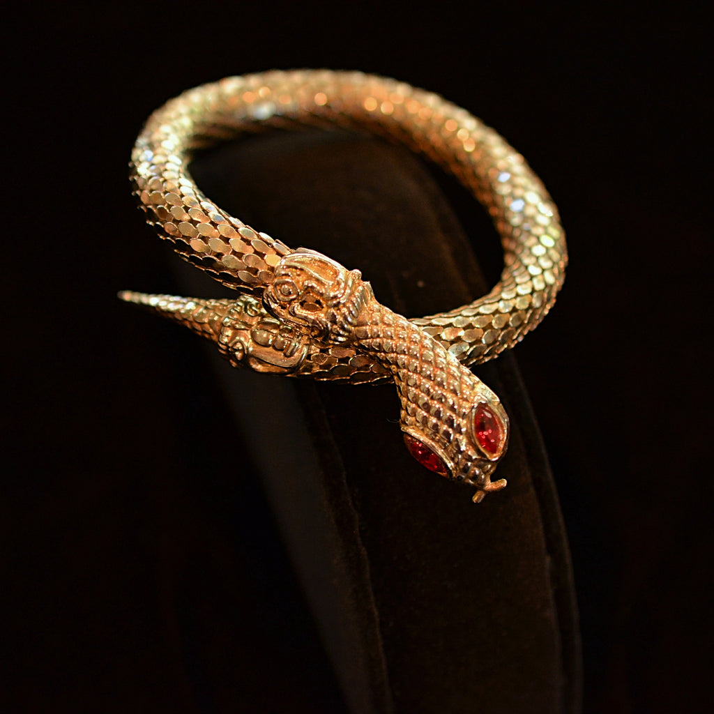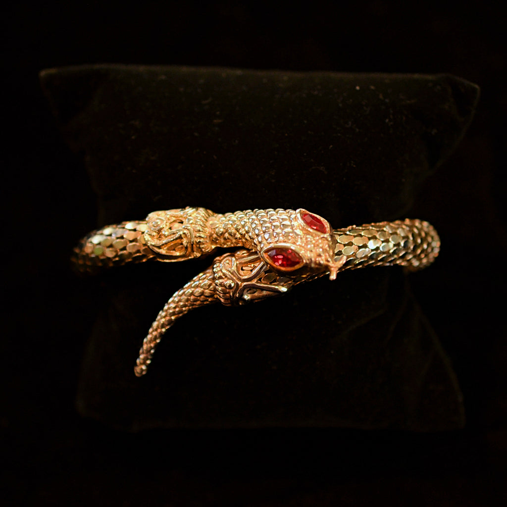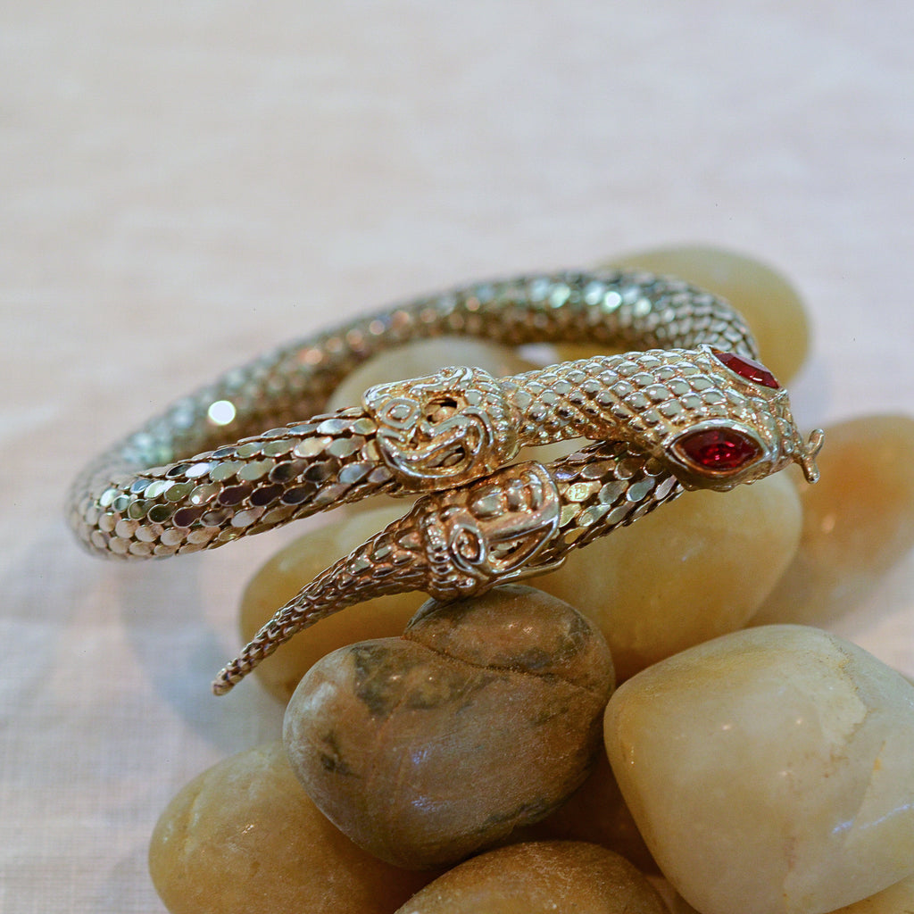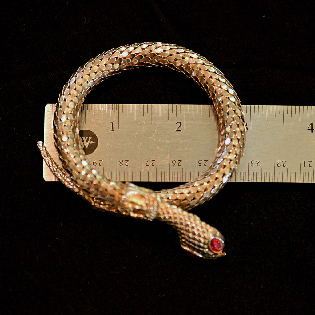 Vintage 70s coil mesh snake bracelet with inset glass stone eyes.