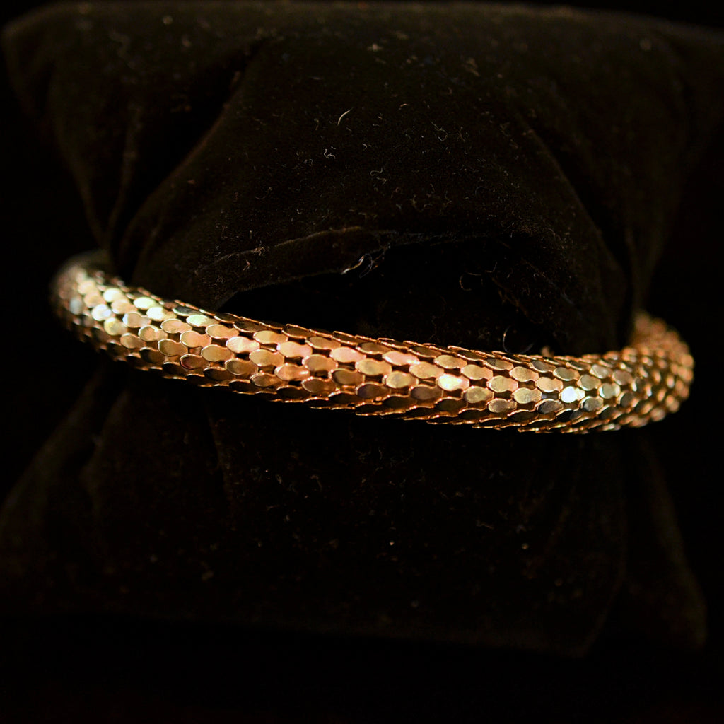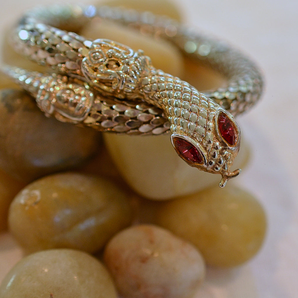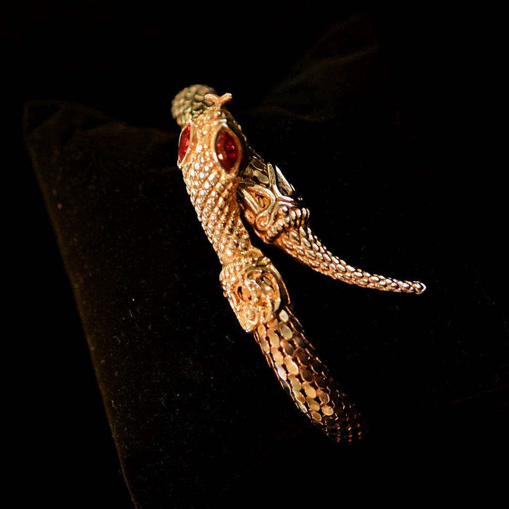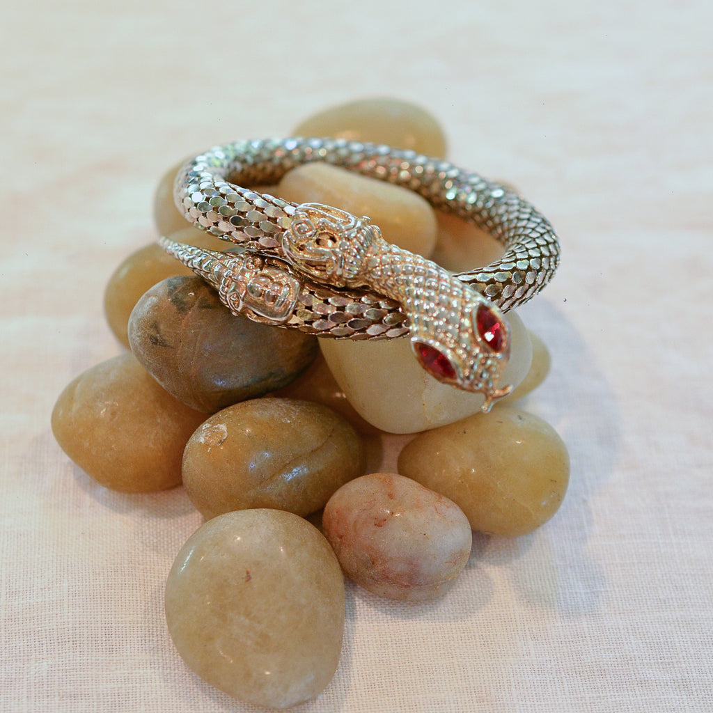 Vintage 70s coil mesh snake bracelet with inset glass stone eyes.