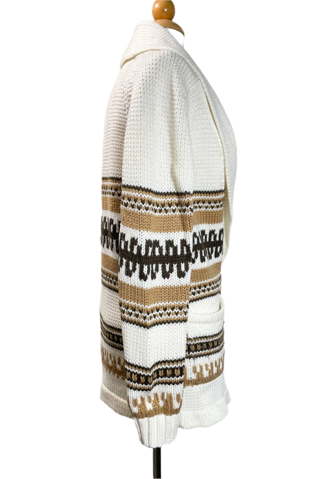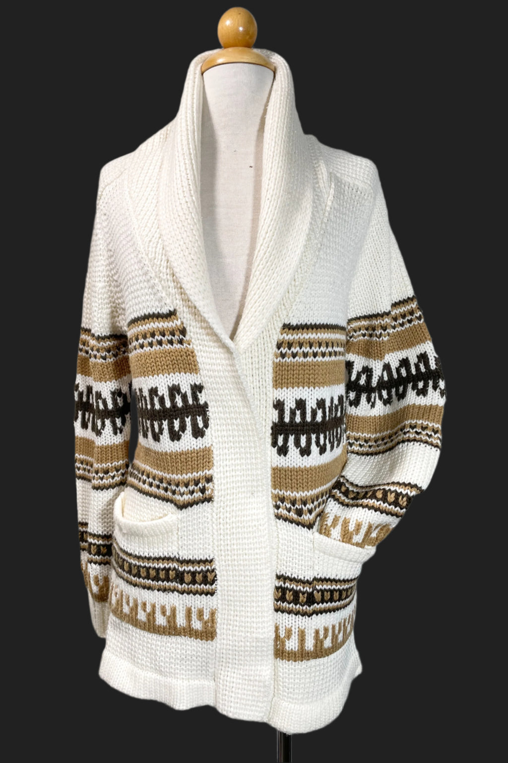 Shawl collar, pockets, wrap front, no buttons or belt.