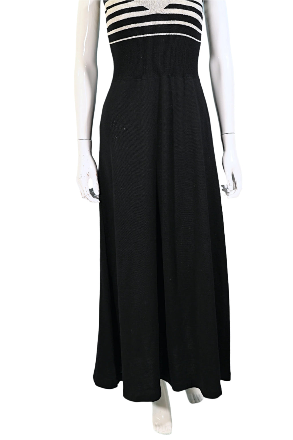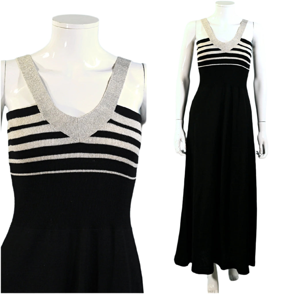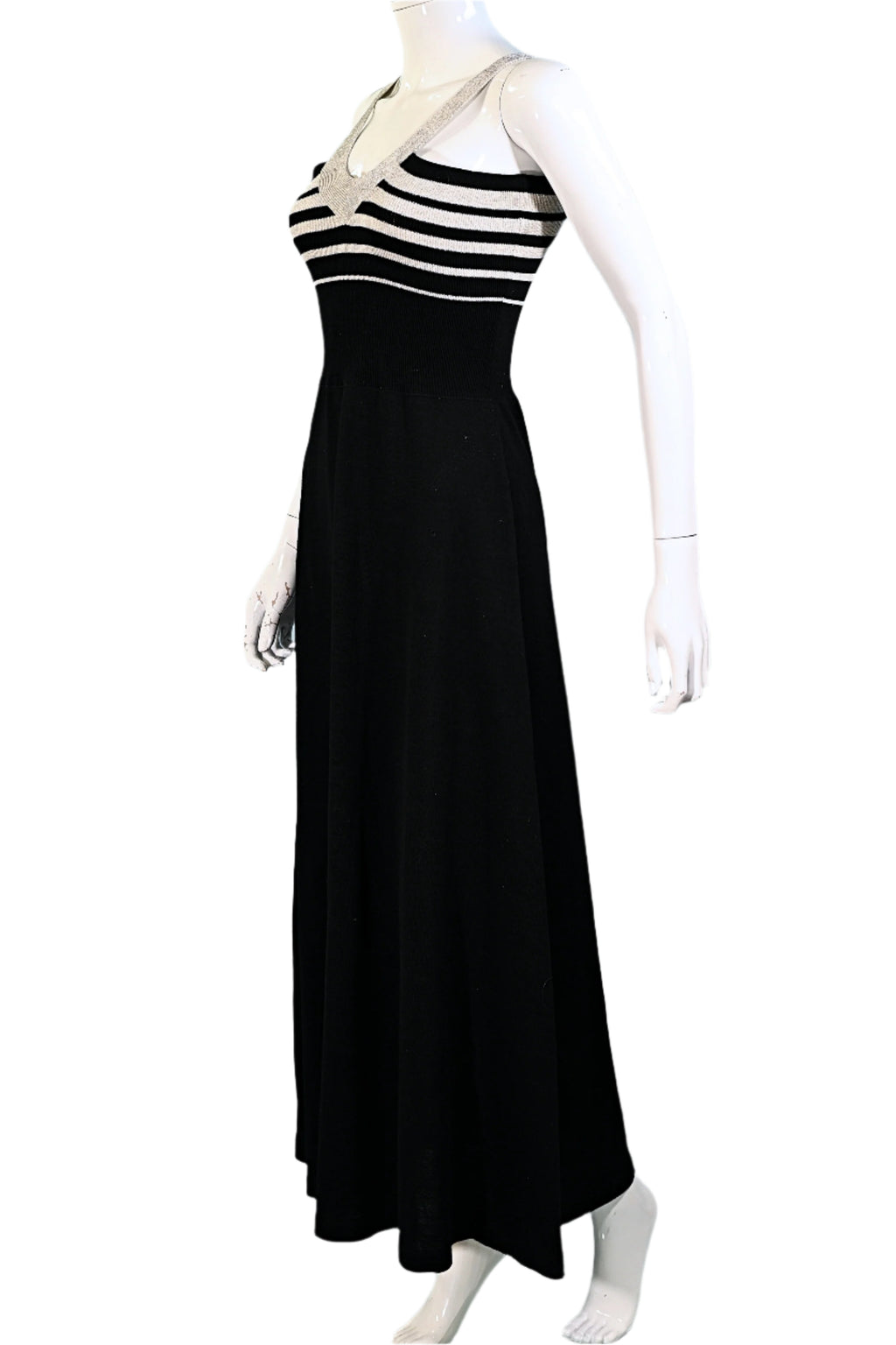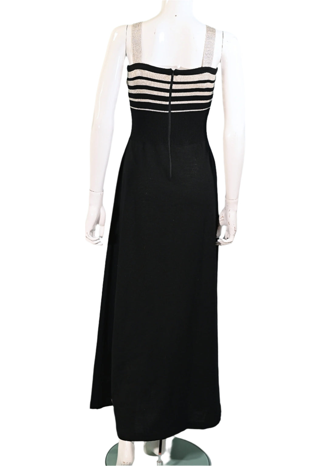 Vintage 70s long black dress with pale gray & metallic silver accents.