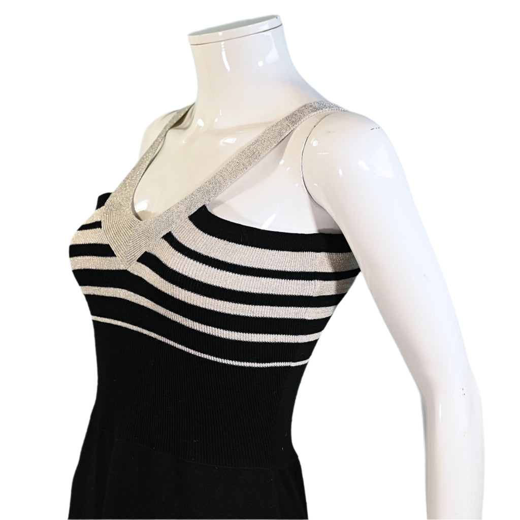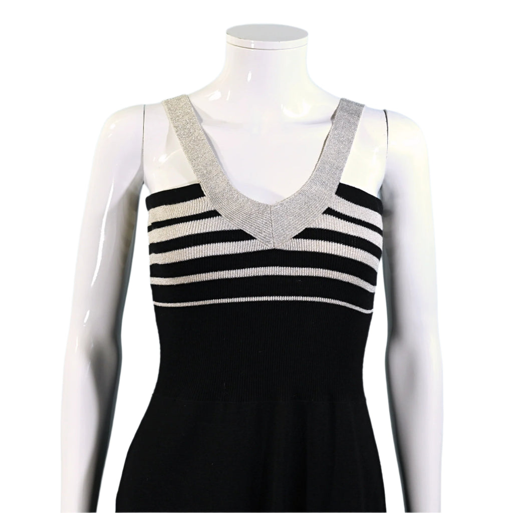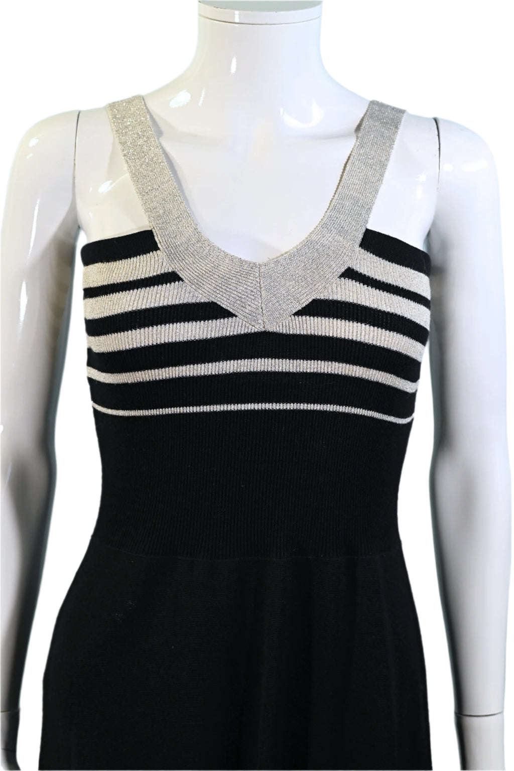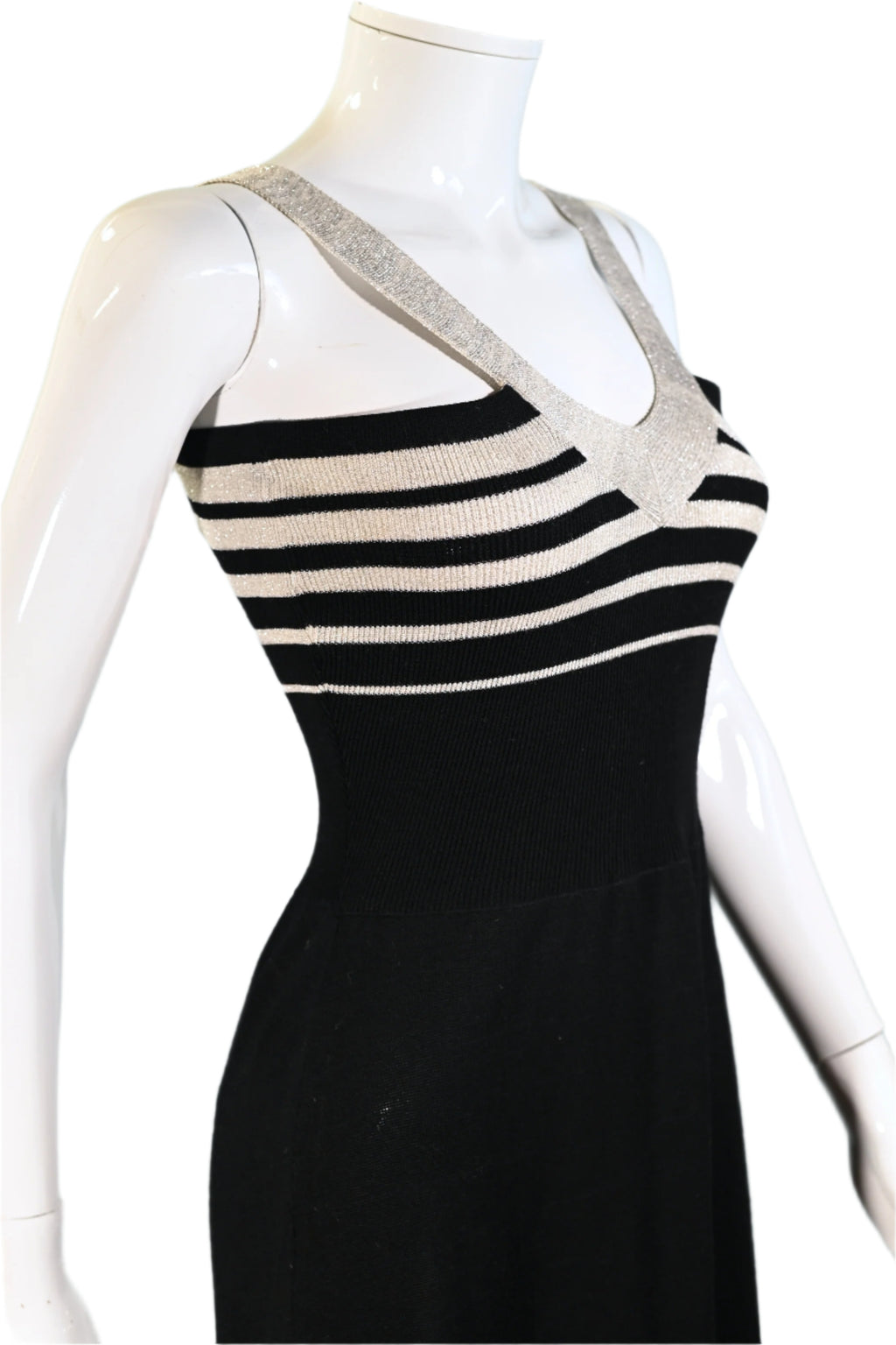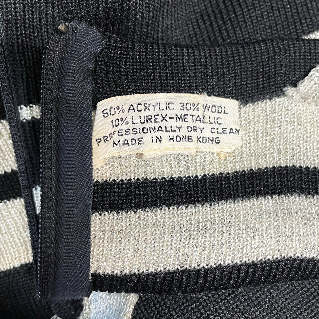 Vintage 70s long black dress with pale gray & metallic silver accents.