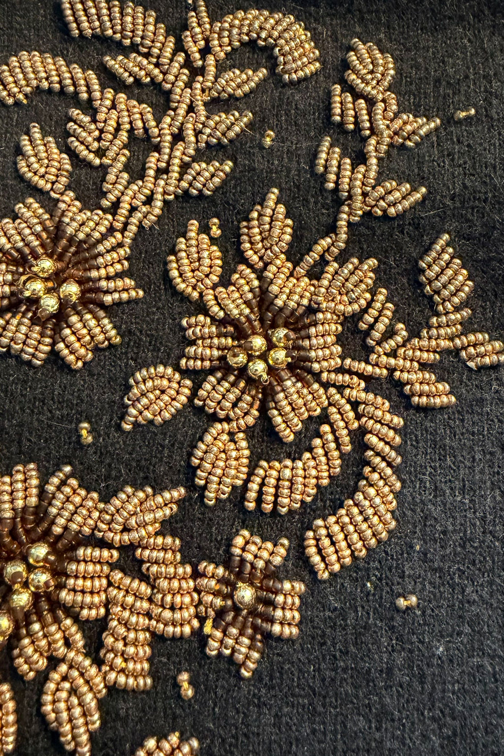 Beautiful black wool evening sweater accented with bronze and gold beads.