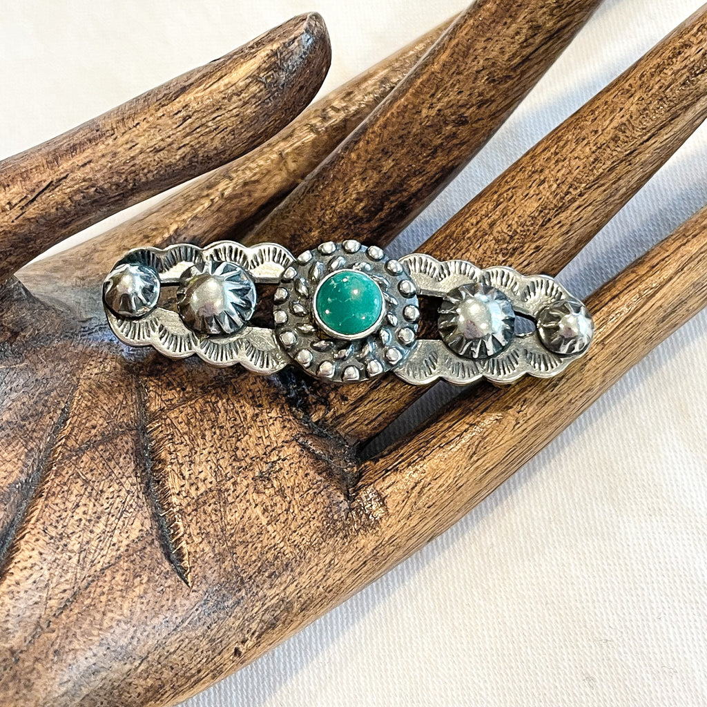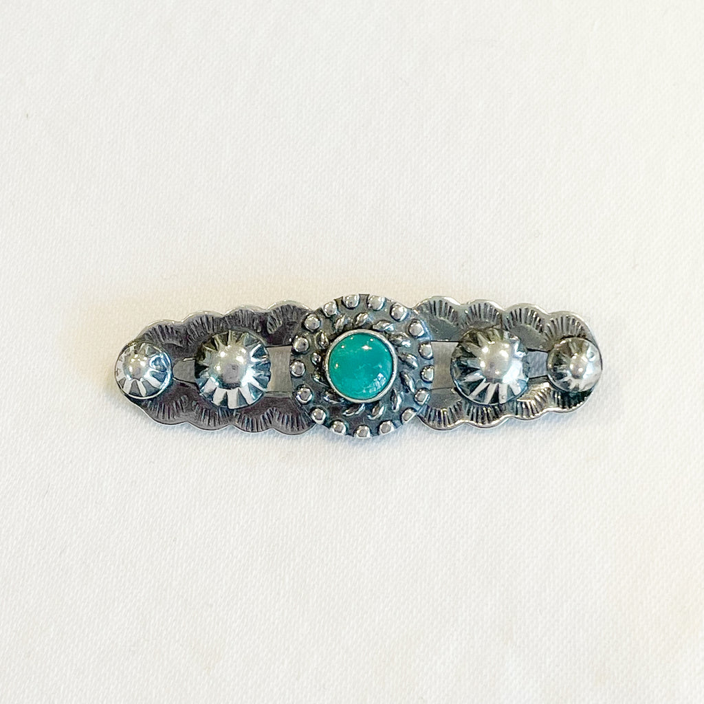 Stamped scalloped edges, raised button and circle medallion in the center with a greenish turquoise stone.