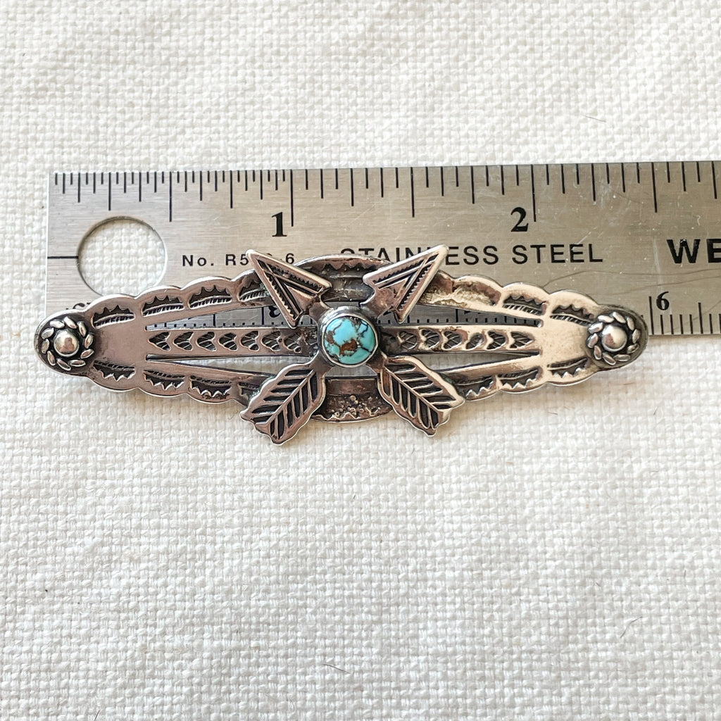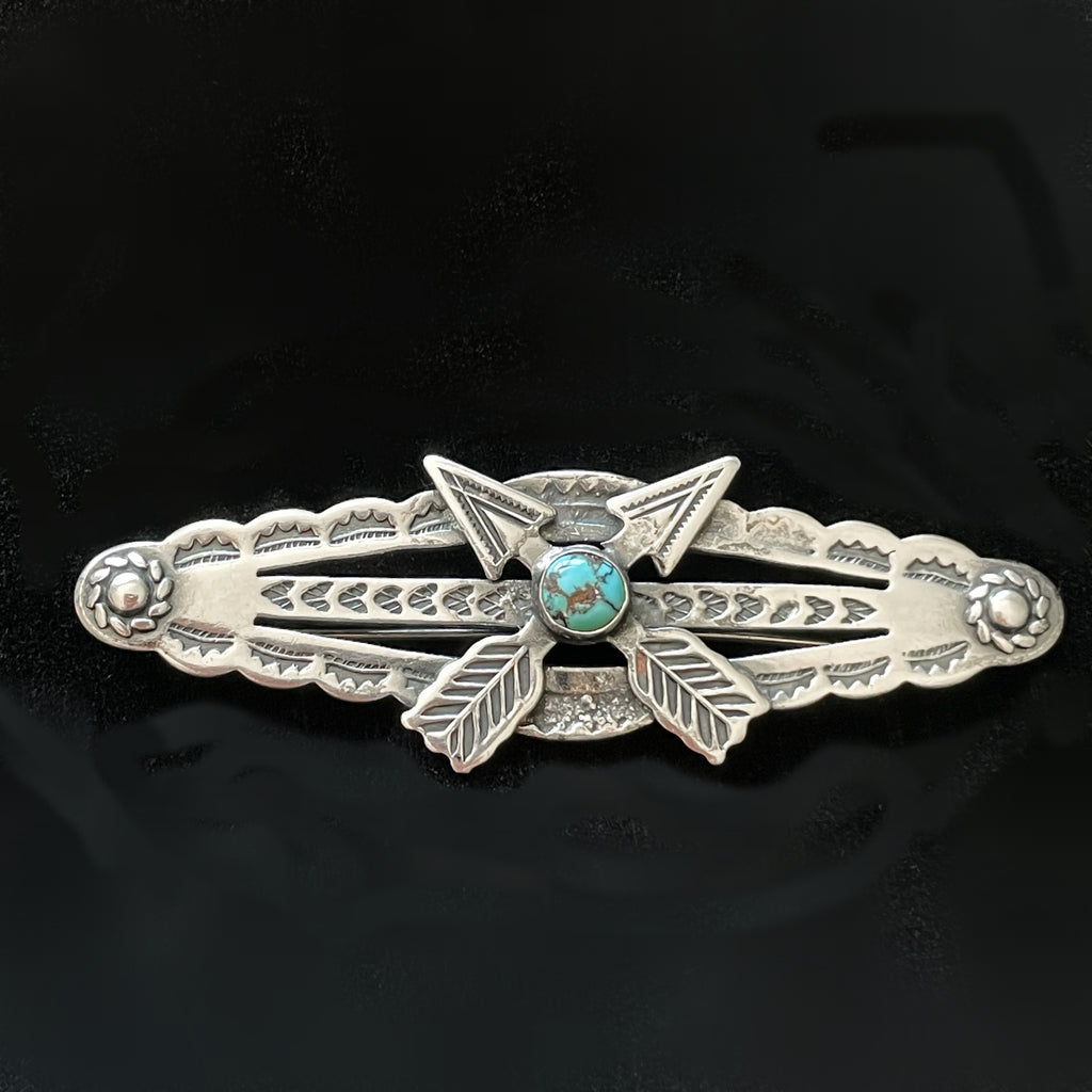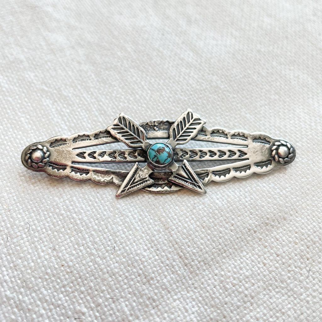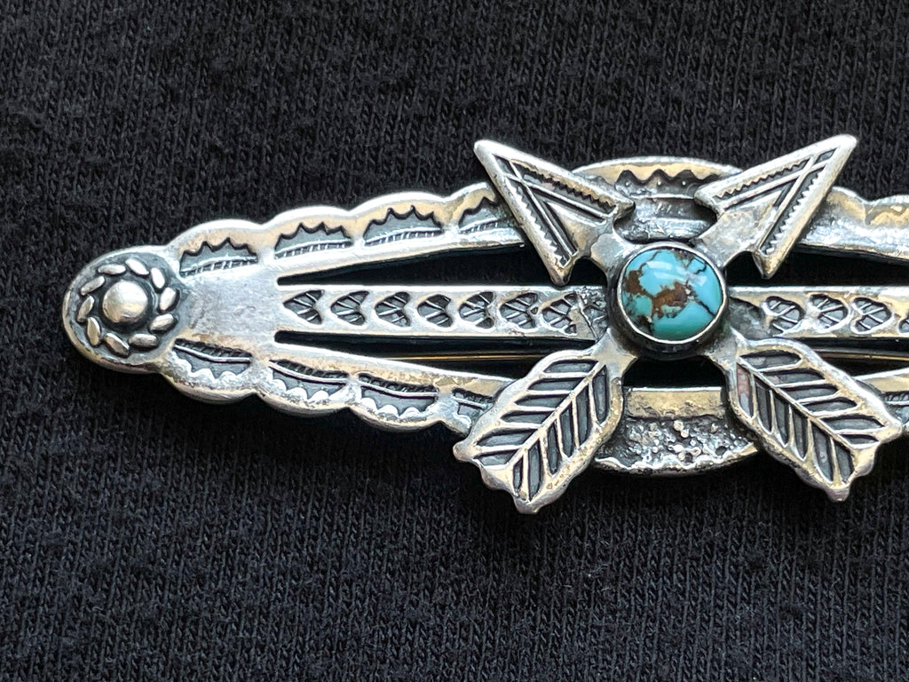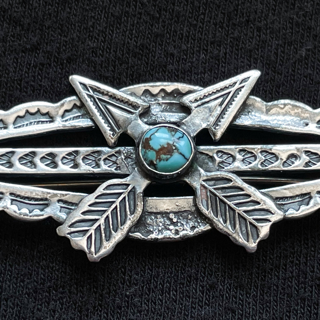 Vintage Fred Harvey Era Crossed Arrows Sterling Silver/Turquoise Stamped Brooch 2 3/8" L