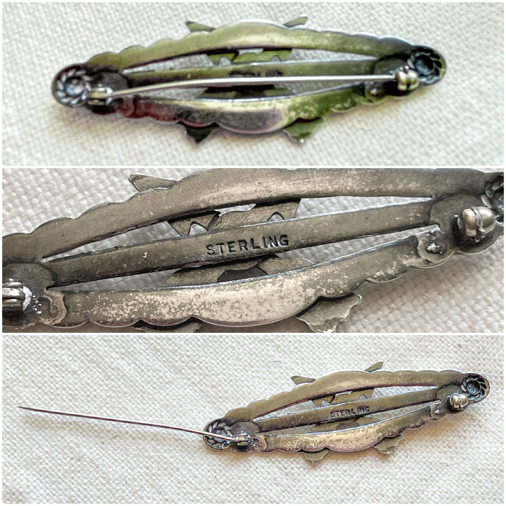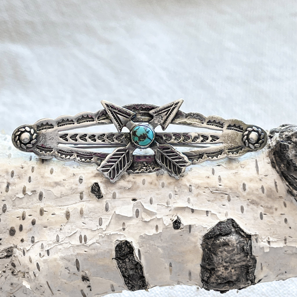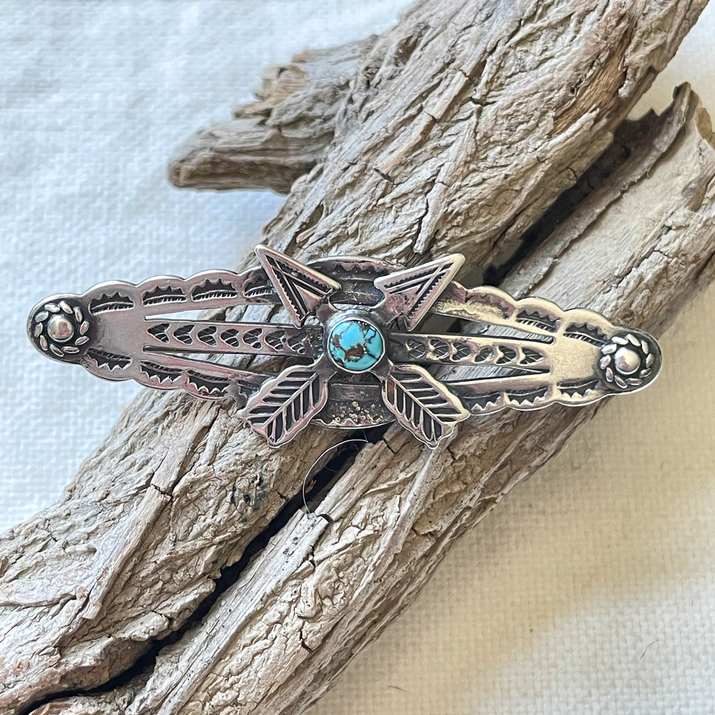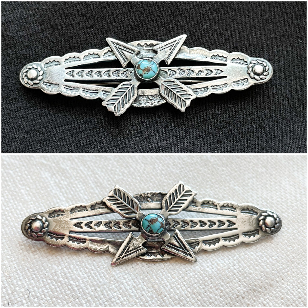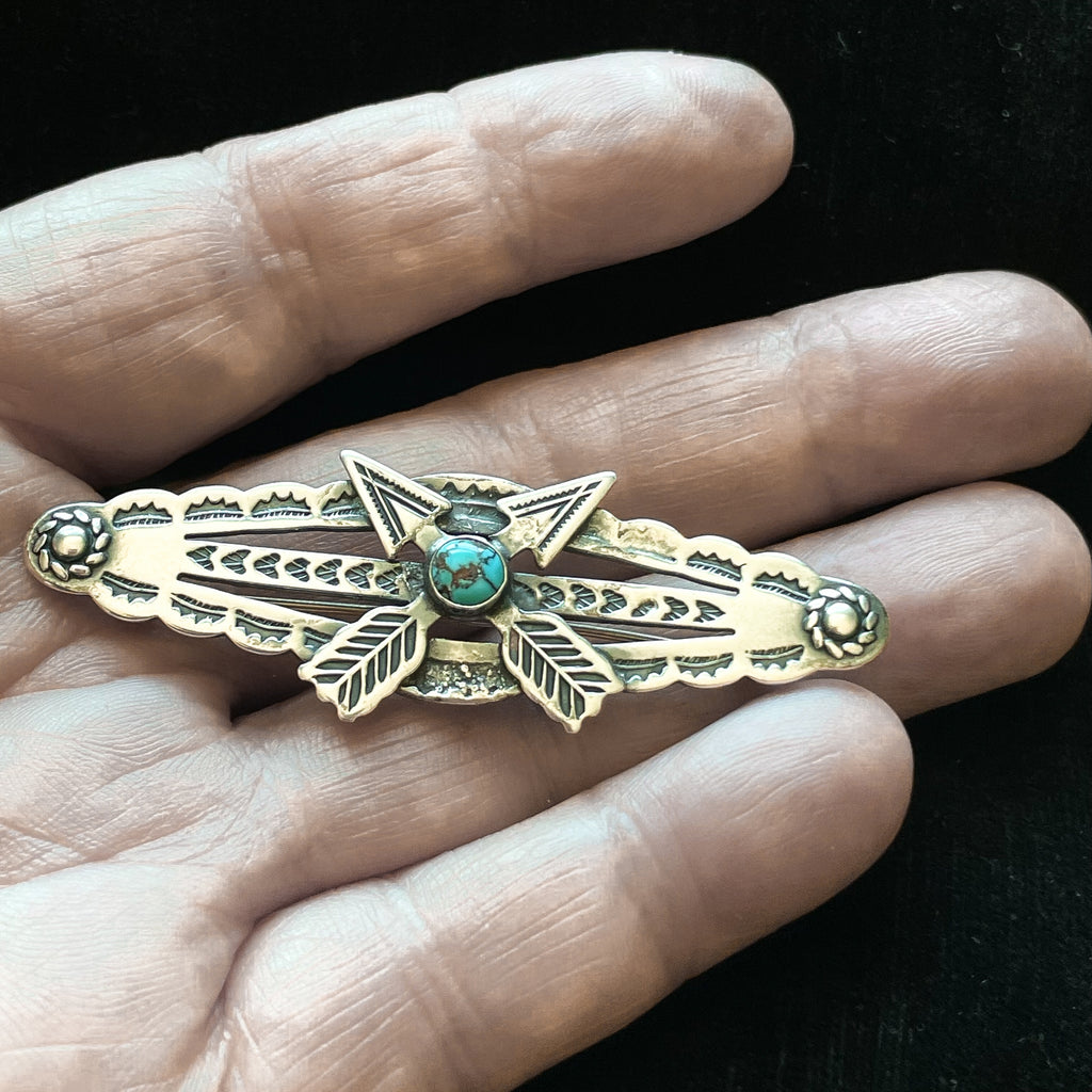 Vintage Fred Harvey Era Crossed Arrows Sterling Silver/Turquoise Stamped Brooch 2 3/8" L