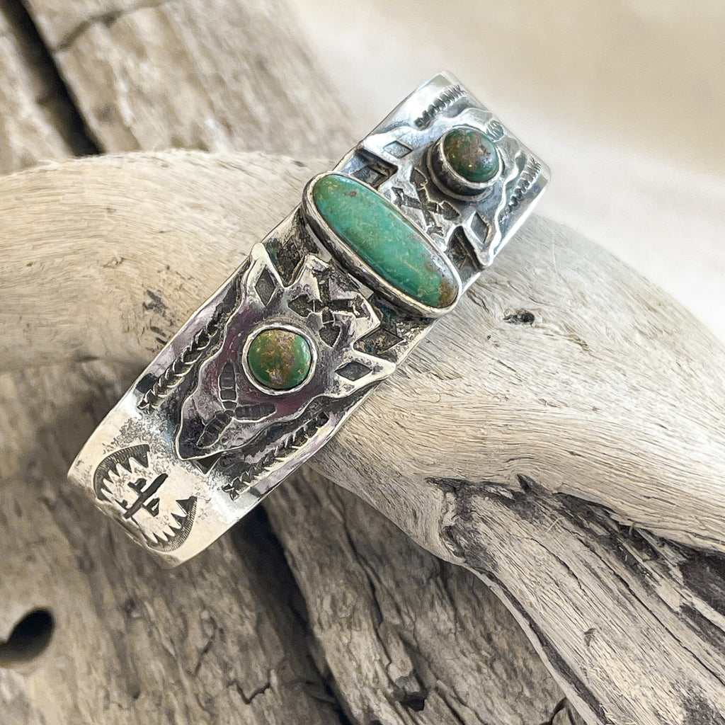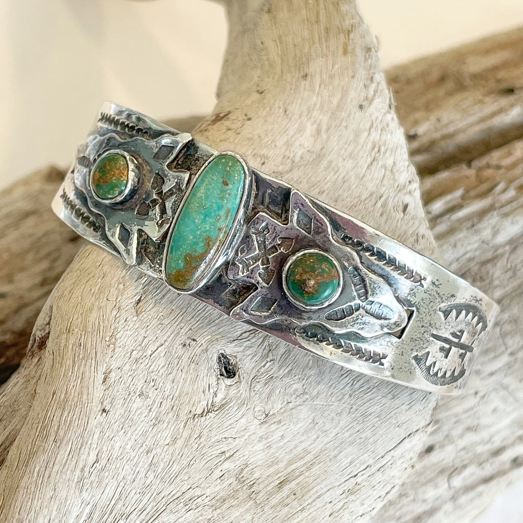 Vintage Fred Harvey era silver bracelet with a 3 turquoise (green turquoise) stones.