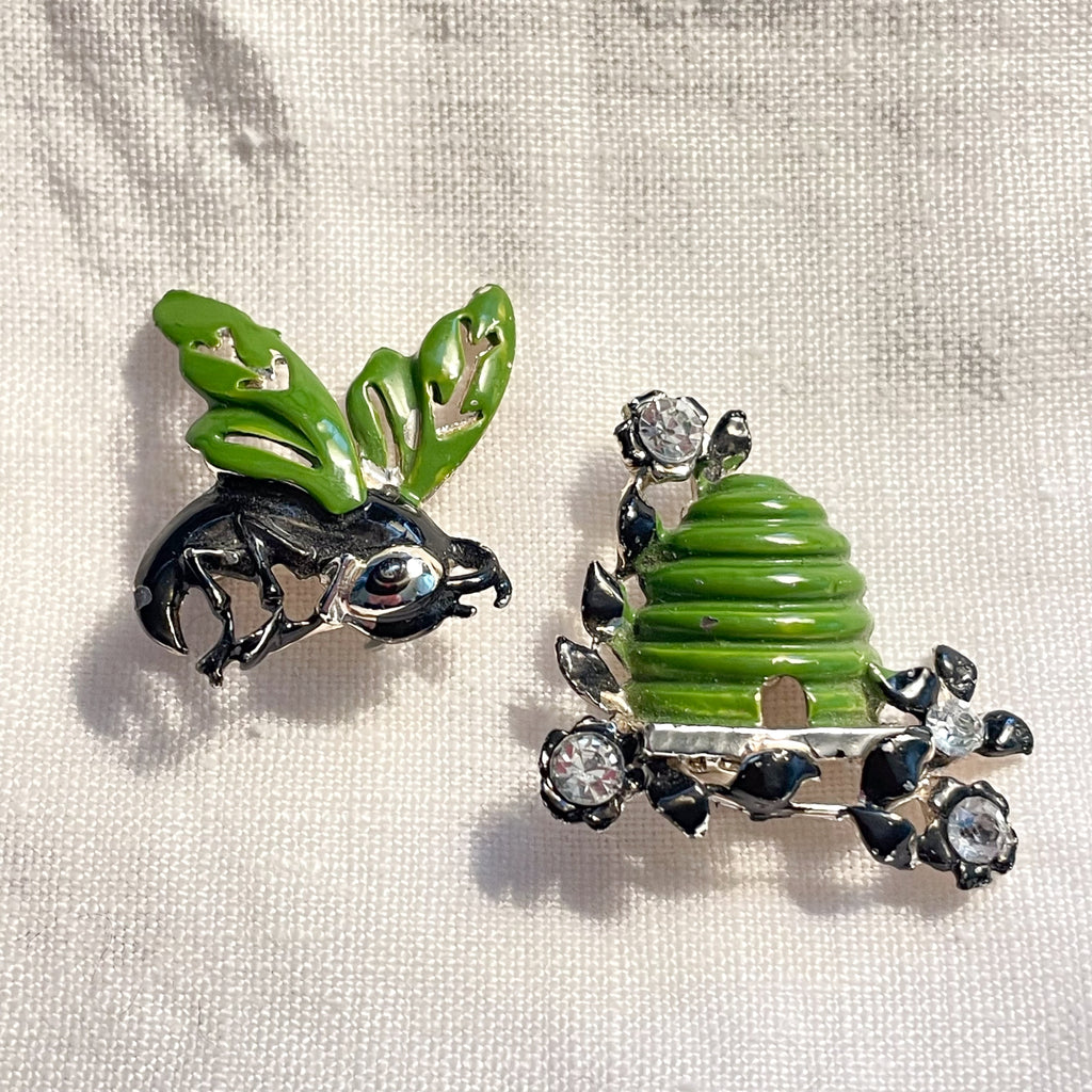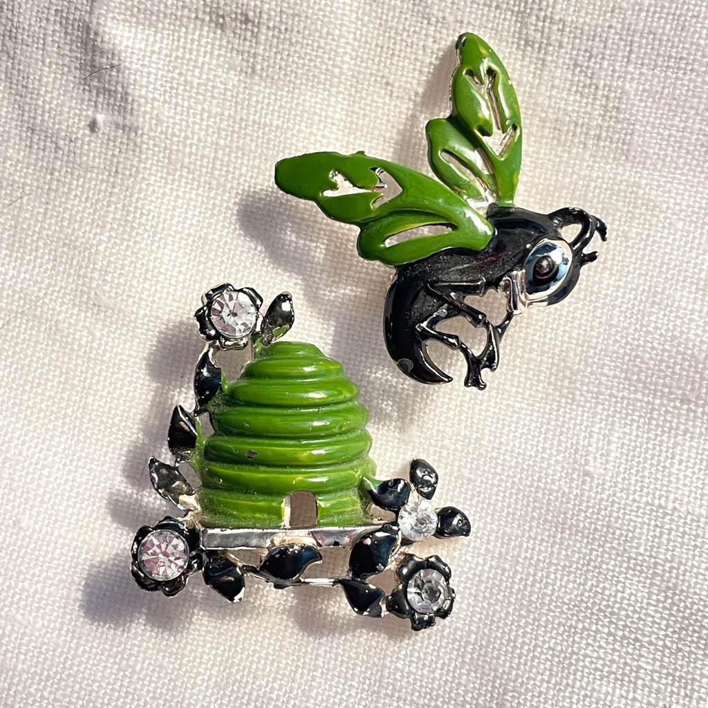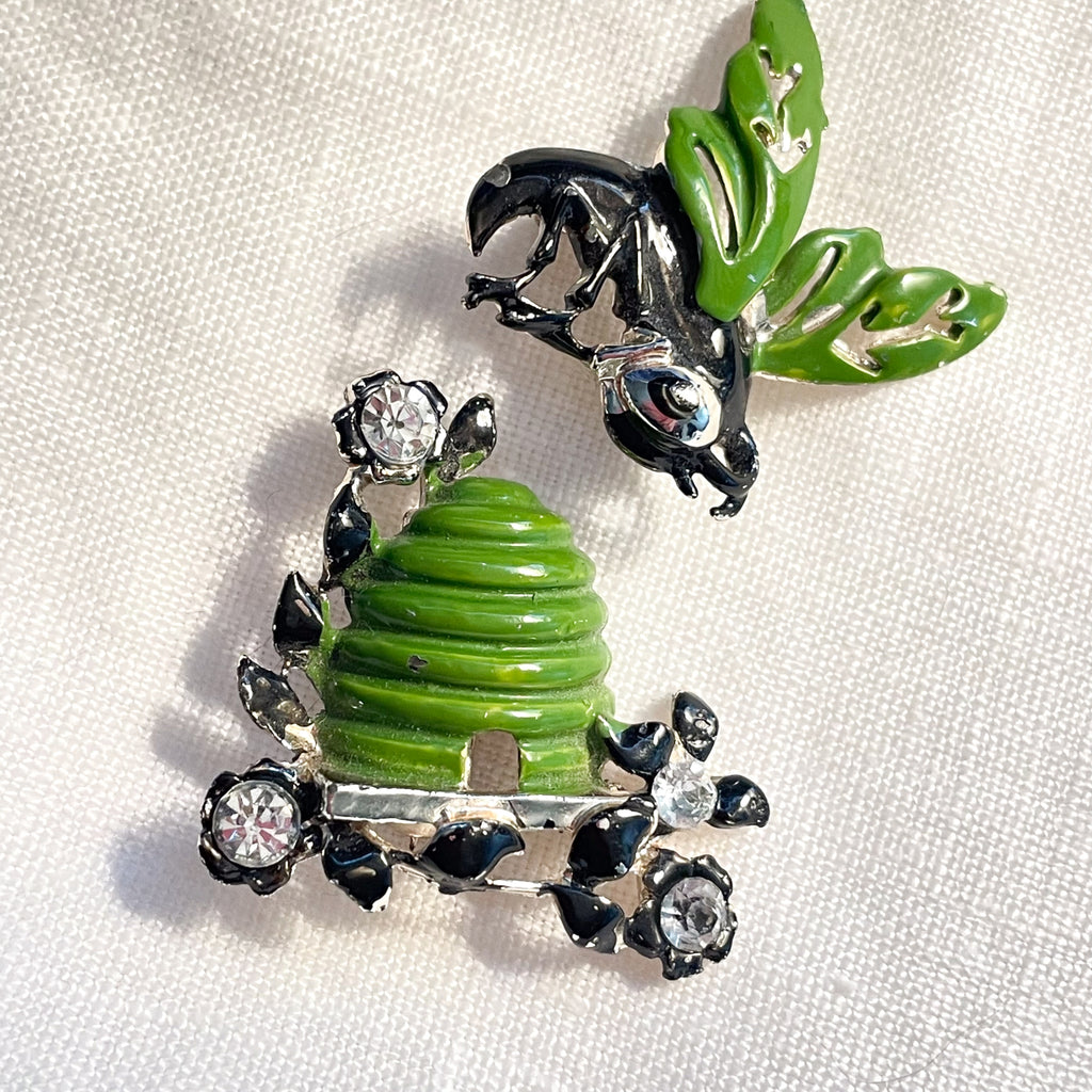 Vintage MCM 2-piece set bee and beehive brooch set.