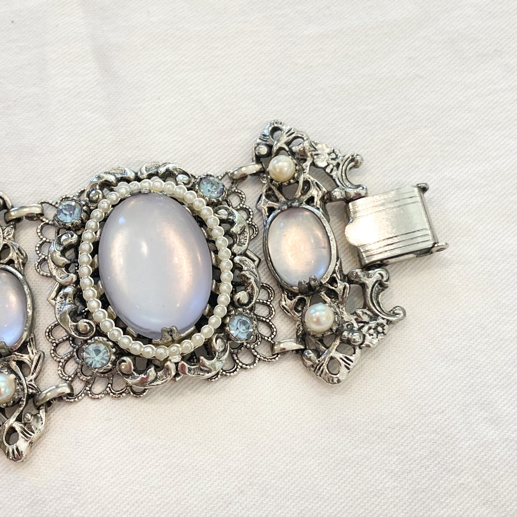 Vintage elaborate silver tone Selro bracelet with 3 large & 4 smaller 'moonglow moonstones, faux pearls, blue rhinestones.