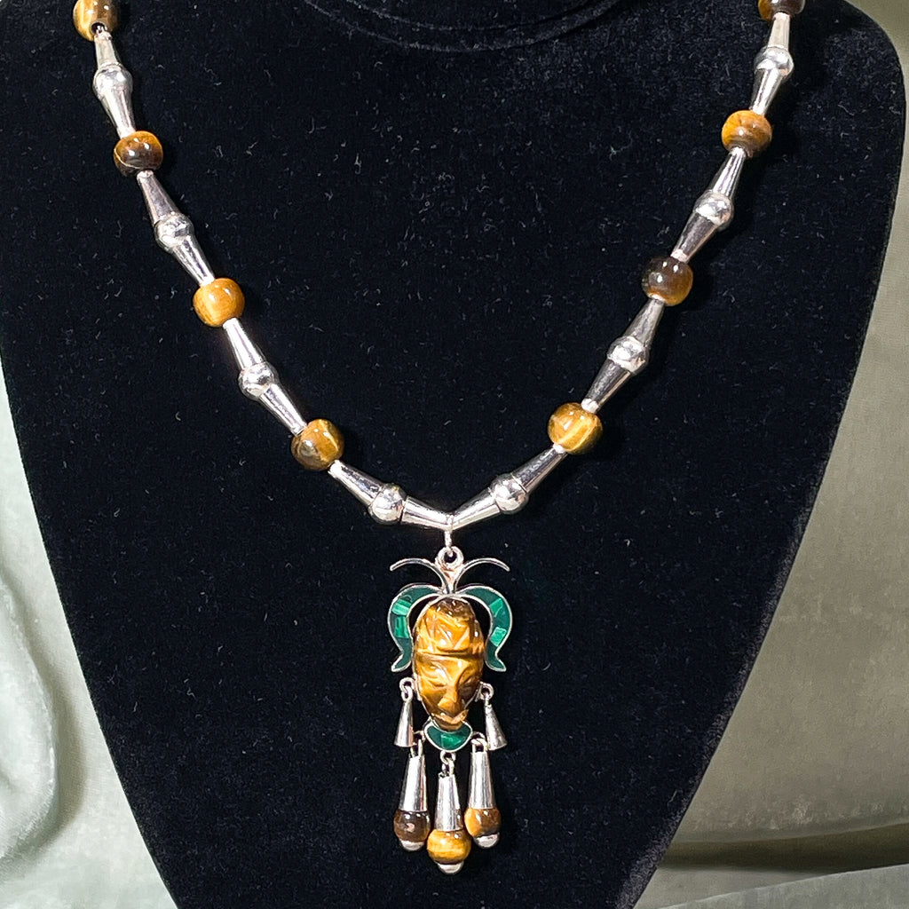 Handmade necklace, silver and tiger's eye carved face & beads, malachite inlay details.