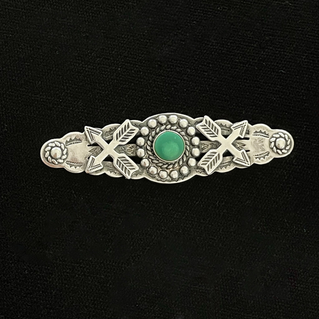 Scalloped edges, crossed arrows, turquoise stone in the center.
