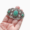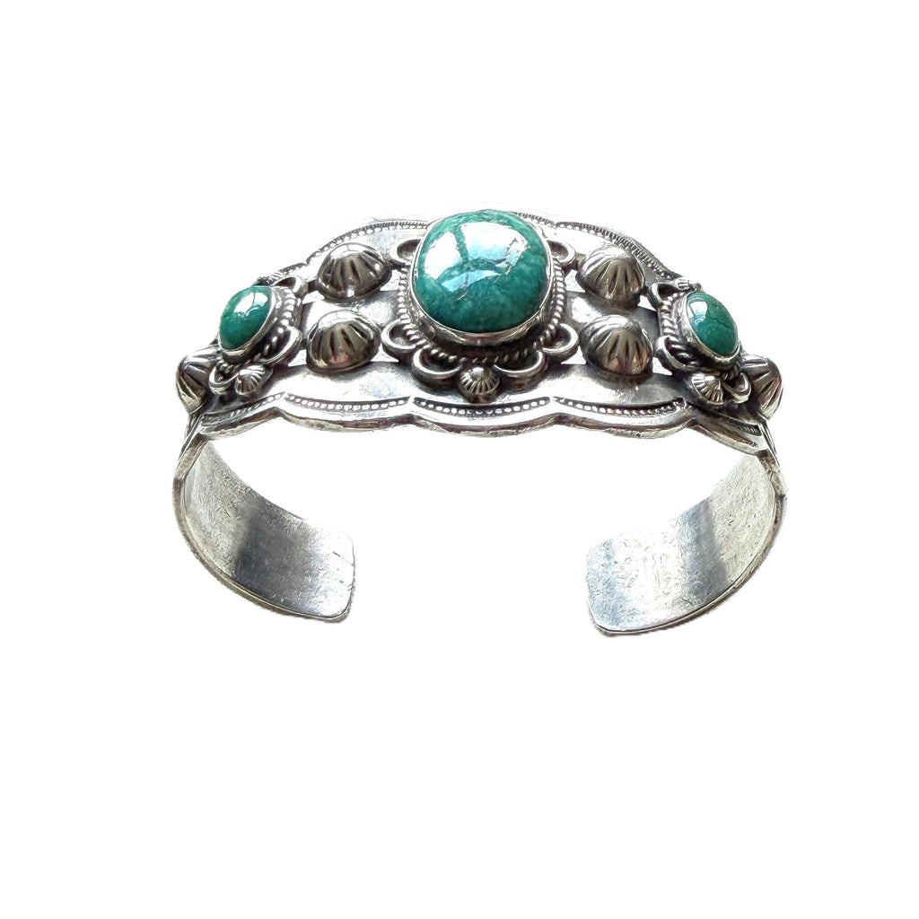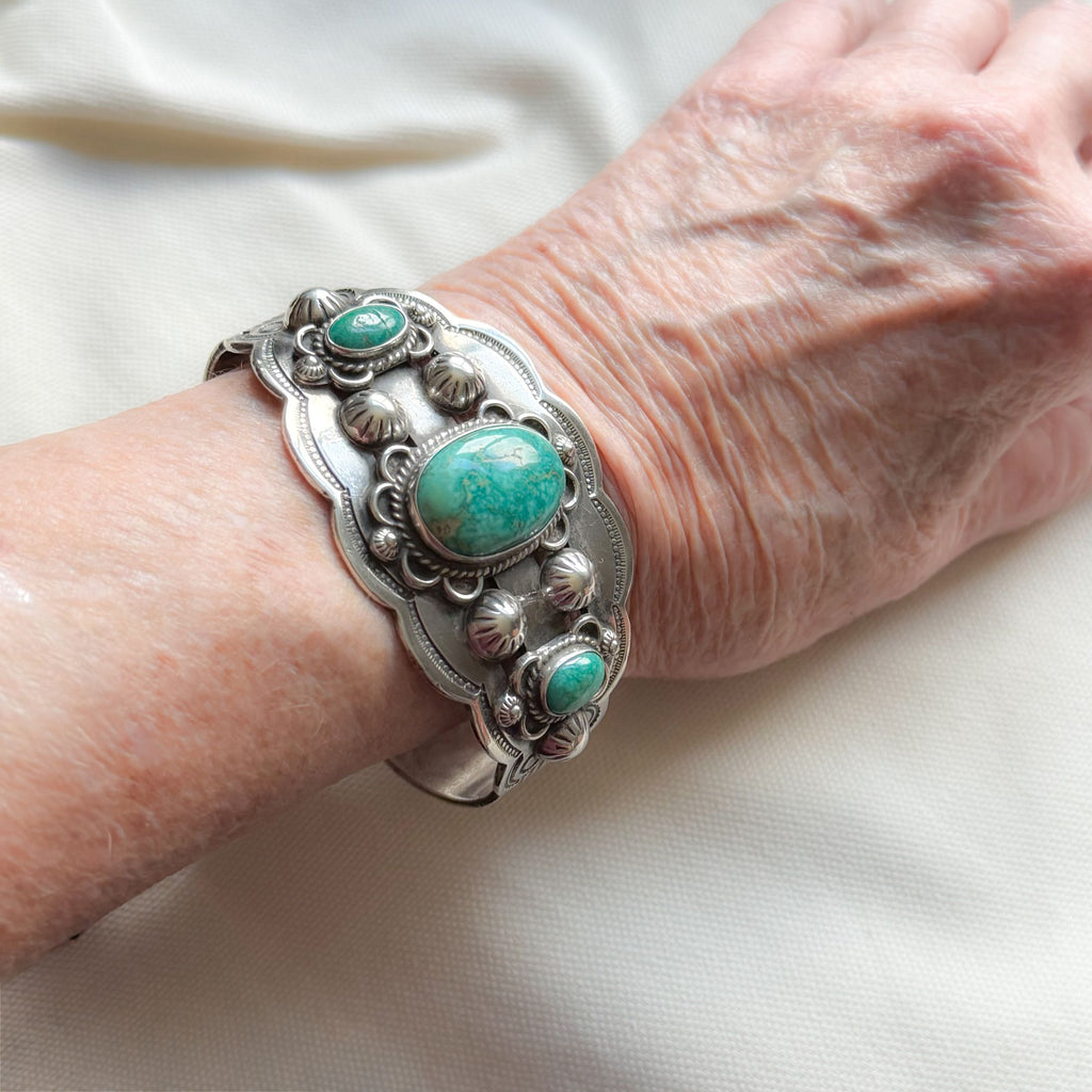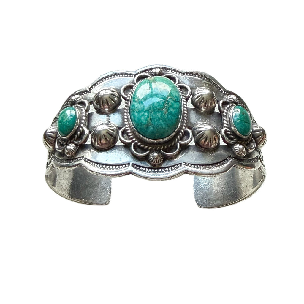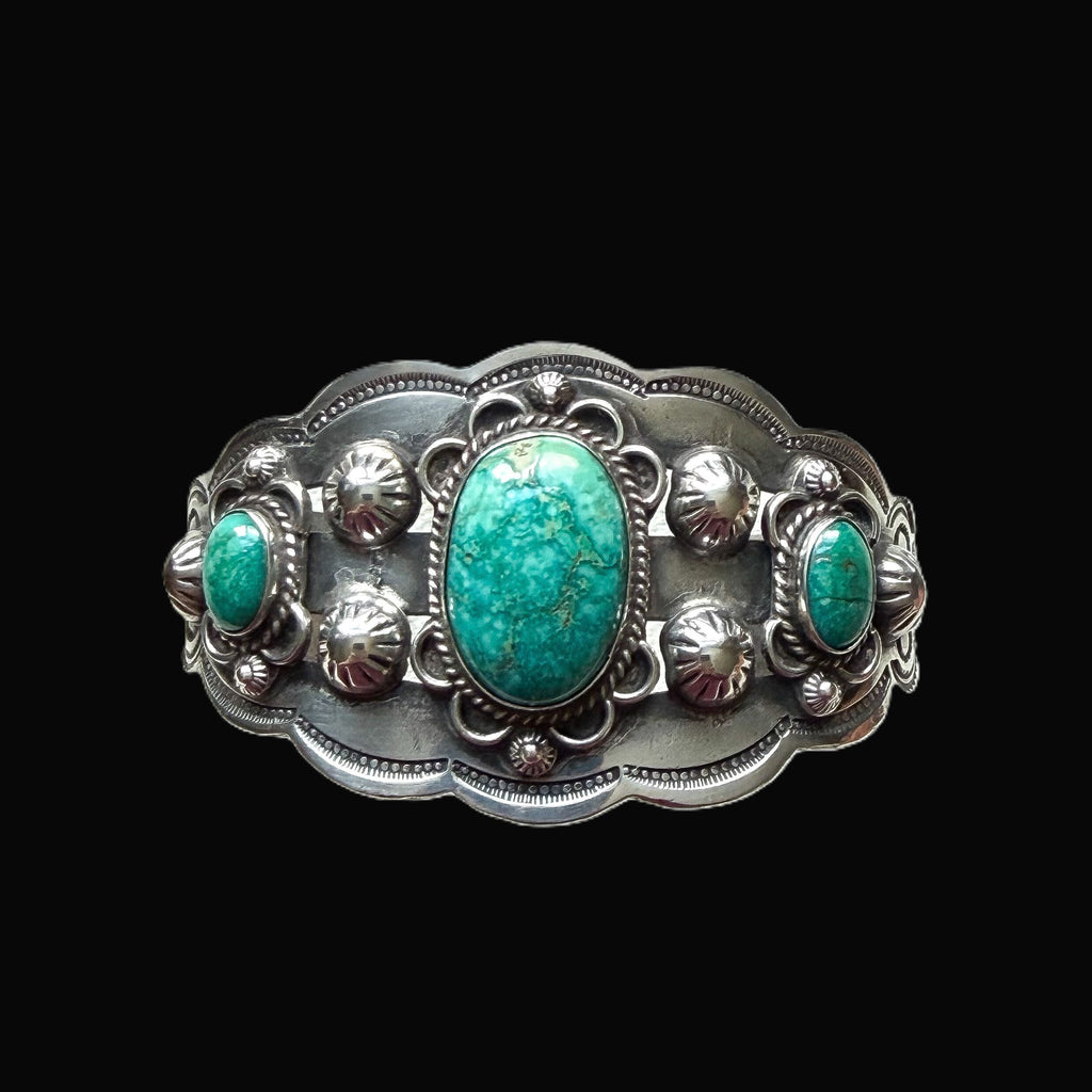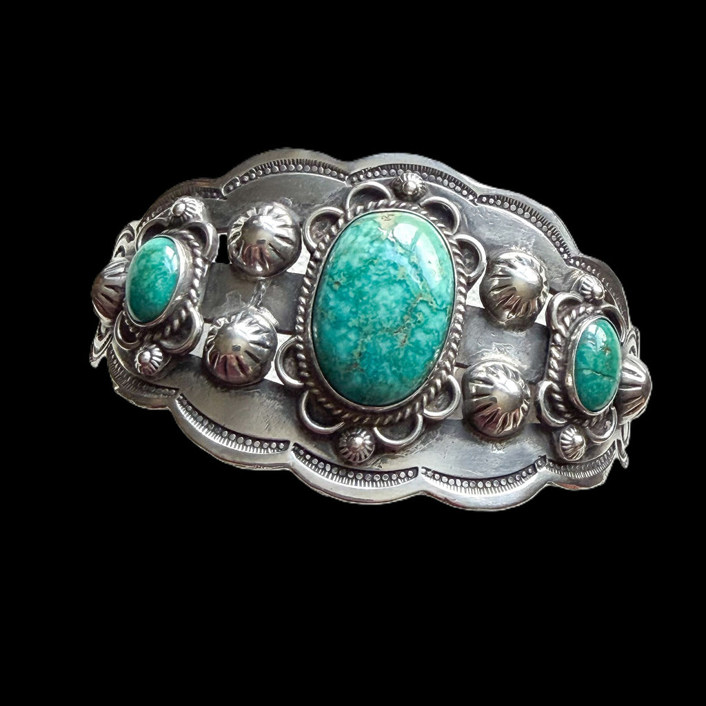 Gorgeous vintage sterling silver cuff bracelet with 3 oval turquoise stones.