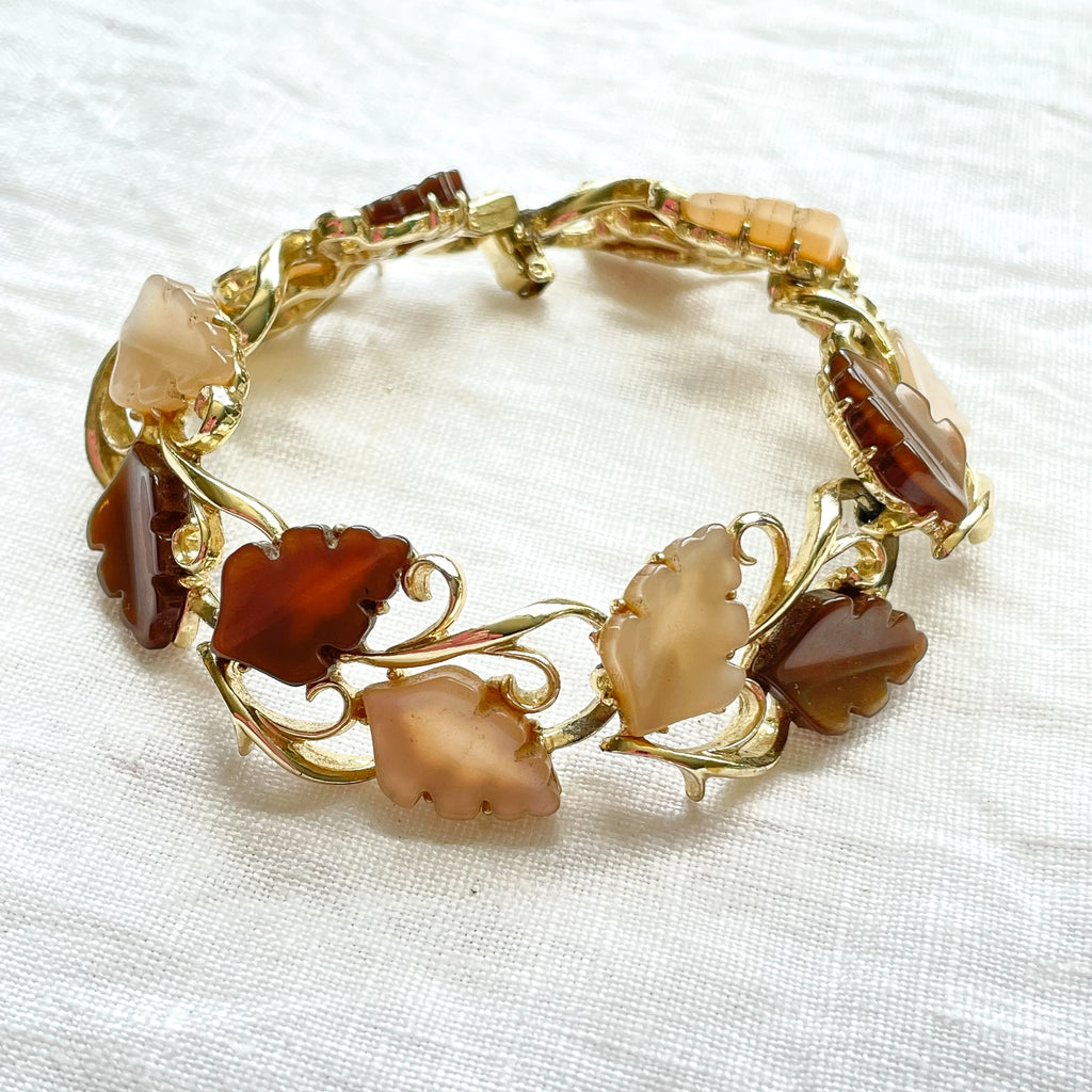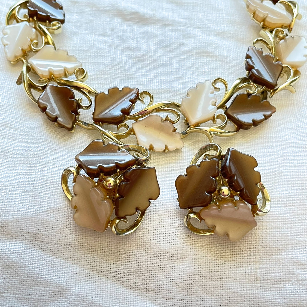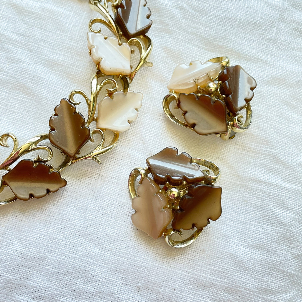 Vintage MCM leaf pattern thermoset bracelet and earring set.