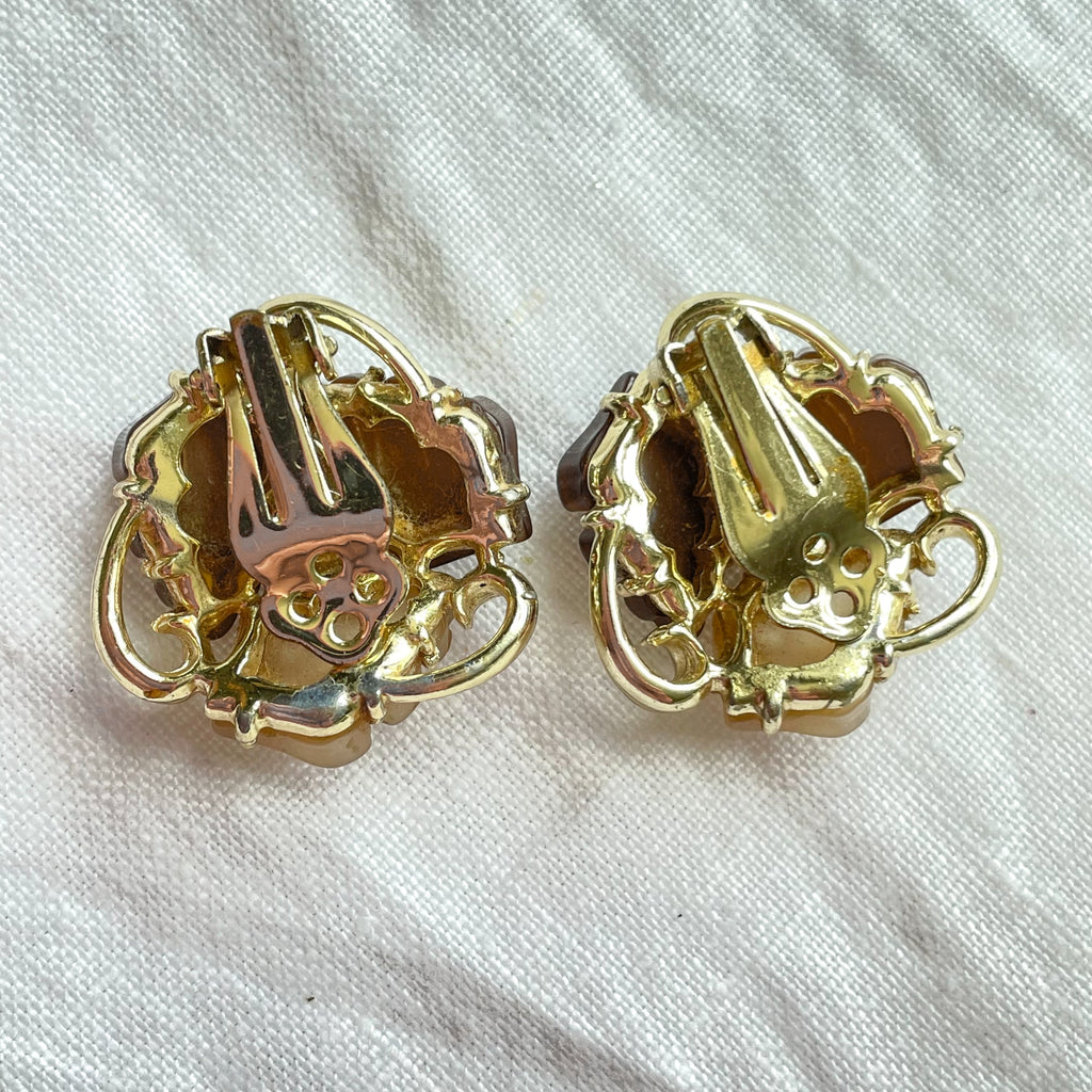 The gold tone metal is open with swirl designs. Prong set leaf stones.